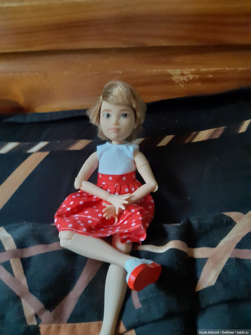 Ехала она со мной в машине, и один из взглядов брошенных на дверь вдруг встретился с куклиным (как правильно склонить?). Вообще, она изначально была неплохая то кукла, и мне понравилась, но когда я её крутанула перед камерой для помидоротопика — закрылась. Я даже думала её пристроить в новый дом.