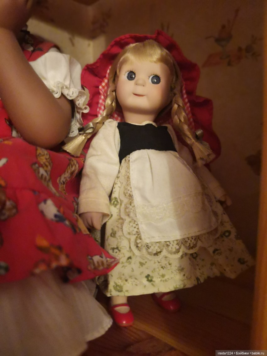 Наши куклы были немного упрощены в одежде, это видно по Красной Шапочке, нет на обороте капора клетки, нет корзинки и нет бантиков и вместо вставных глаз нарисованные глаза, другой молд, но все равно они милы.