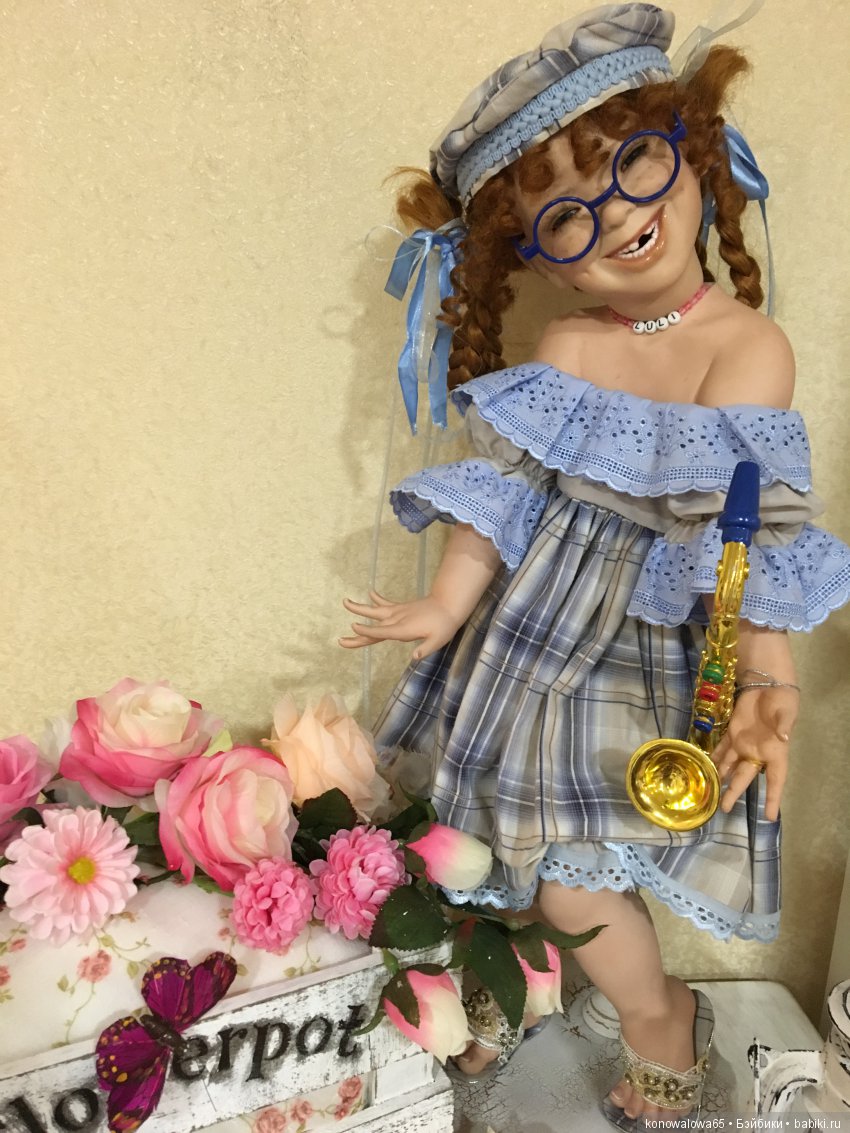 А ведь она, очень притягивающая, невероятно милая девчушка, только имя ее мне как то, не приглянулось и стали мы ее называть -маленькая Циля. Циля(PJ) фарфоровая кукла, молд PJ редкий, автор Dawn Adams, ростик 65 см, ручная роспись лица, глазки стекло, зубик у дантиста оставили, образ и одежда выполнено мной. Куколка невероятно веселая, игривая, танцует и играет на саксофоне.