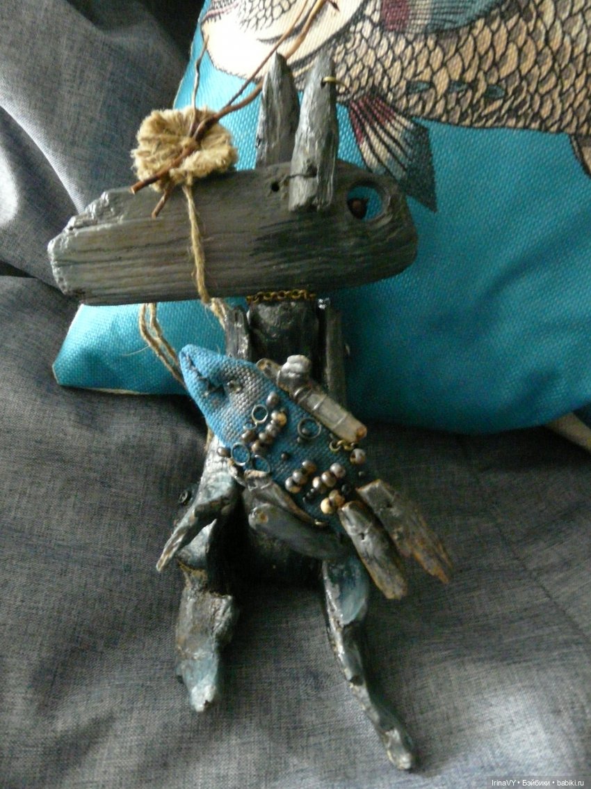 Сегодня представляю Вашему вниманию зайчишку и волка. Они из разных сказочных миров, но объединяют их использованные материалы: дрифтвуд (собранные на берегах северной реки деревяшечки), медная проволока, немного краски и бусин.