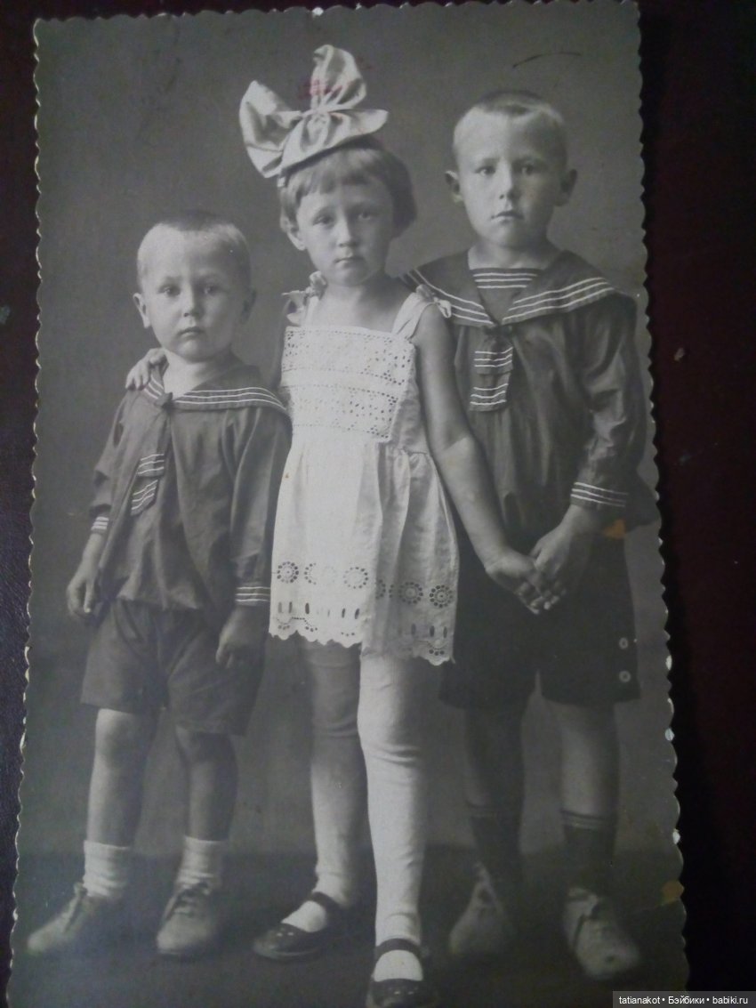 Например, журнал «Вестник моды» от 1927 года демонстрировал несколько платьев такого фасона: с лифом, украшенным кружевом и плиссированной юбочкой, с вышивкой на груди и юбкой – тюльпан. Мальчиков наряжали в рубашки – матроски и брюки или шорты.