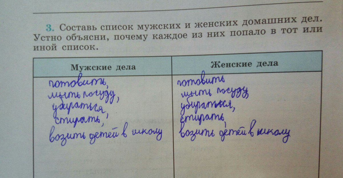 По факту часто поощряется участие девочек в кухне, уборке, уходе за младшими детьми, а у мальчиков – участие в “традиционно мужских делах”.