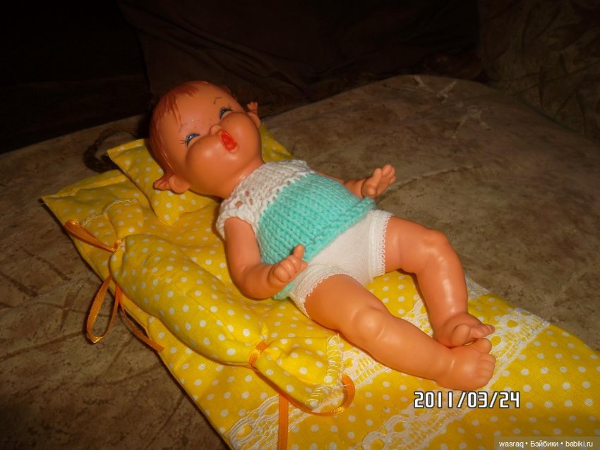 Пупс без маркировки, но на китайца он не похож. Сделан качественно и целиком из винила. Был в одежке, явно с чужого плеча. Примерно 35 см.