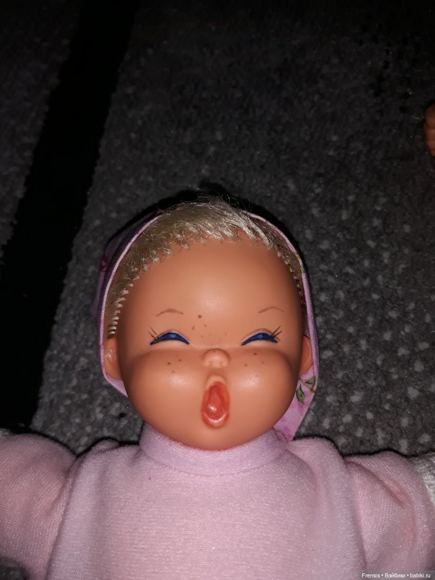 Эта девочка без маркировок, но личико похоже на Zapf. И она весьма старенькая, судя по каркасу из поролона внутри.