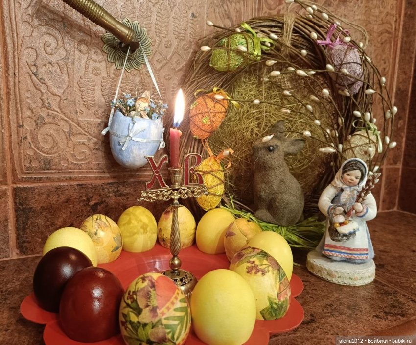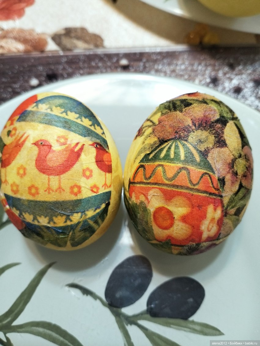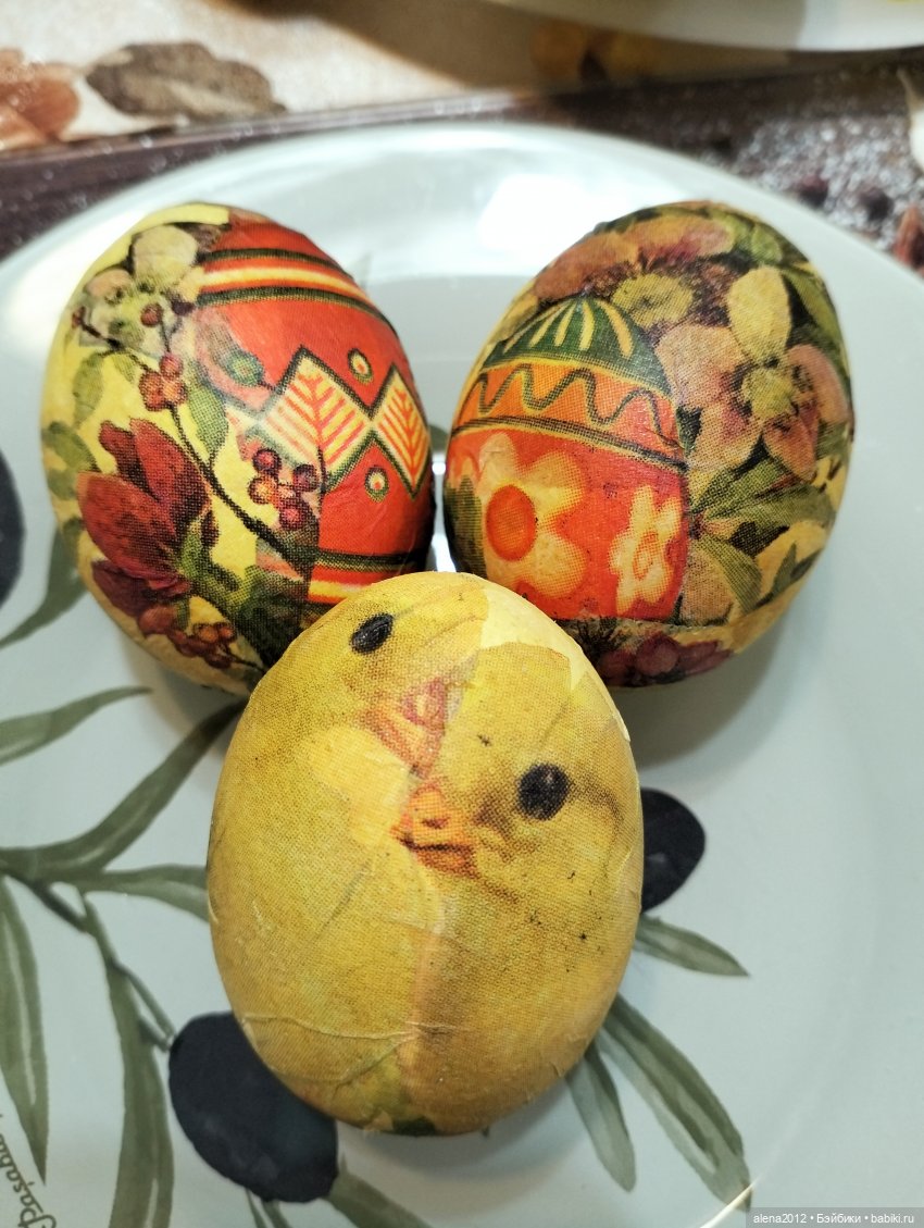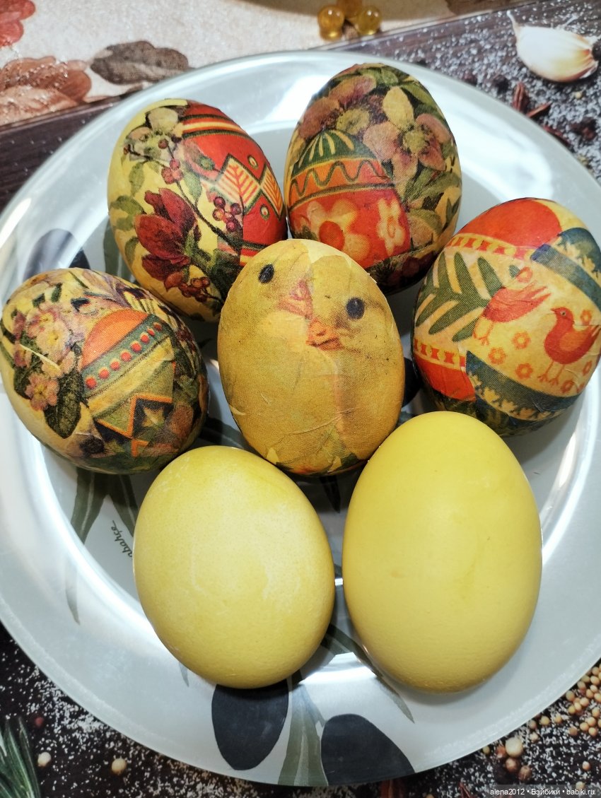 В этом году пыталась красить яйца куркумой. Обещанной интернетом красоты не получилось. Пришлось уже готовое декупажить салфеткой.