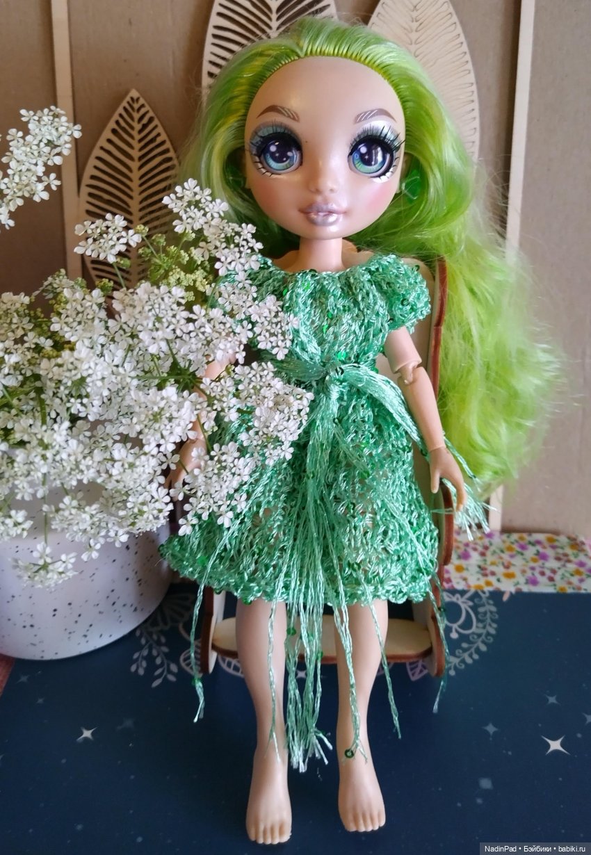 Зелёное платье одолжили у Русалки Рейнбоу, юбка с блёстками, синяя кофта и красное платье были связаны специально для принцессы.