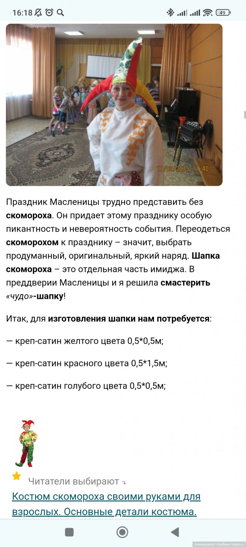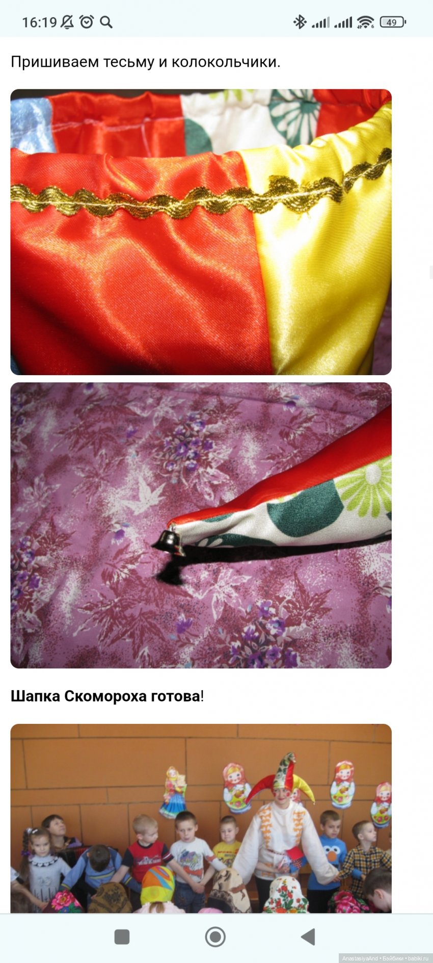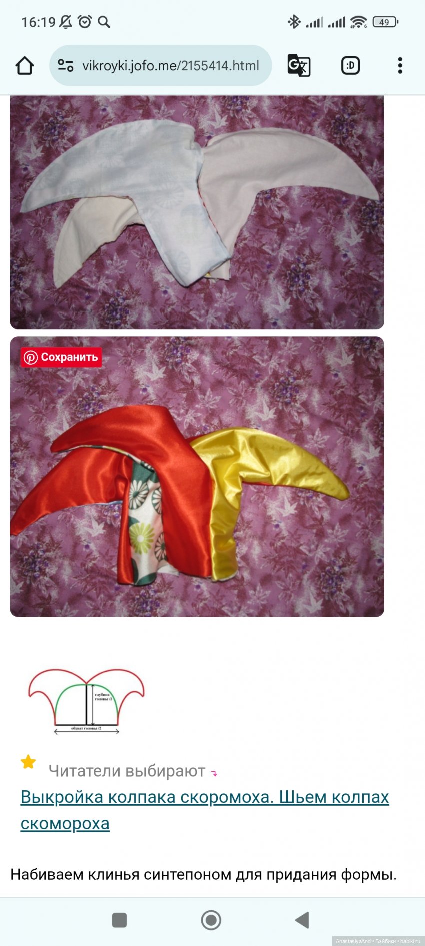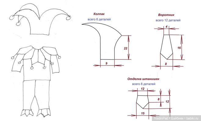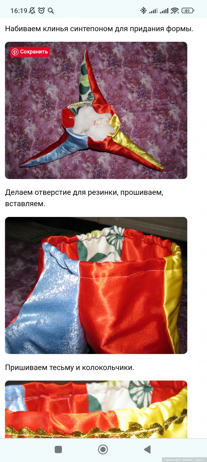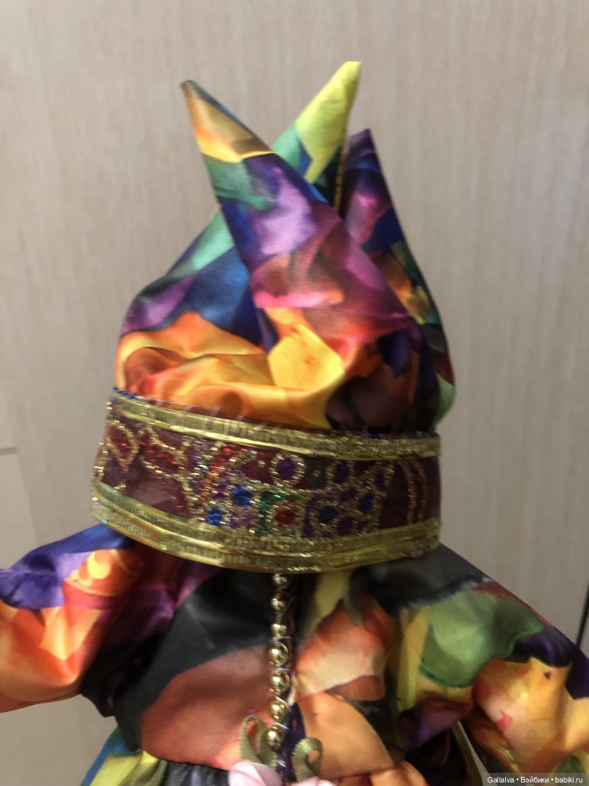 Взялась за непростую работу и, кажется, не справляюсь. Никак не могу понять, как сшить сложный шутовской колпак. На фото 1 прототип будущей куклы. Колпак очень сложный и в миниатюре, конечно, сшить его будет трудно, поэтому я согласна на второй вариант — колпак треугольный. Помогите подсказкой, советом или просто добрым словом. Больше половины работы уже сделана, — обратной дороги нет. Все дело в шляпе.