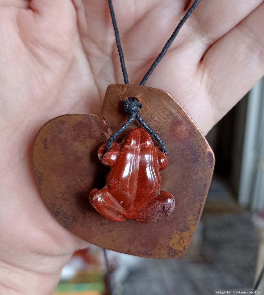 Олин бронзовый водный лист с подаренной ей же лягушкой из яшмы превратились в оригинальное украшение.