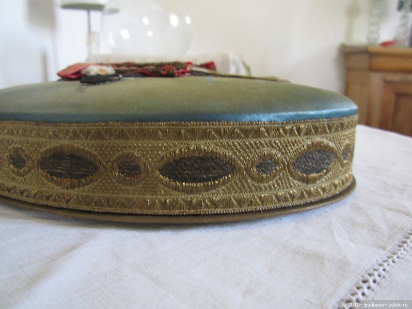 Тоненький кружавчик собрала ниткой на сборку и горячим клеем приклеила снизу по канту накладки, а затем всю накладку с обратной стороны смазала клеем ПВА и приклеила на верх коробки.
