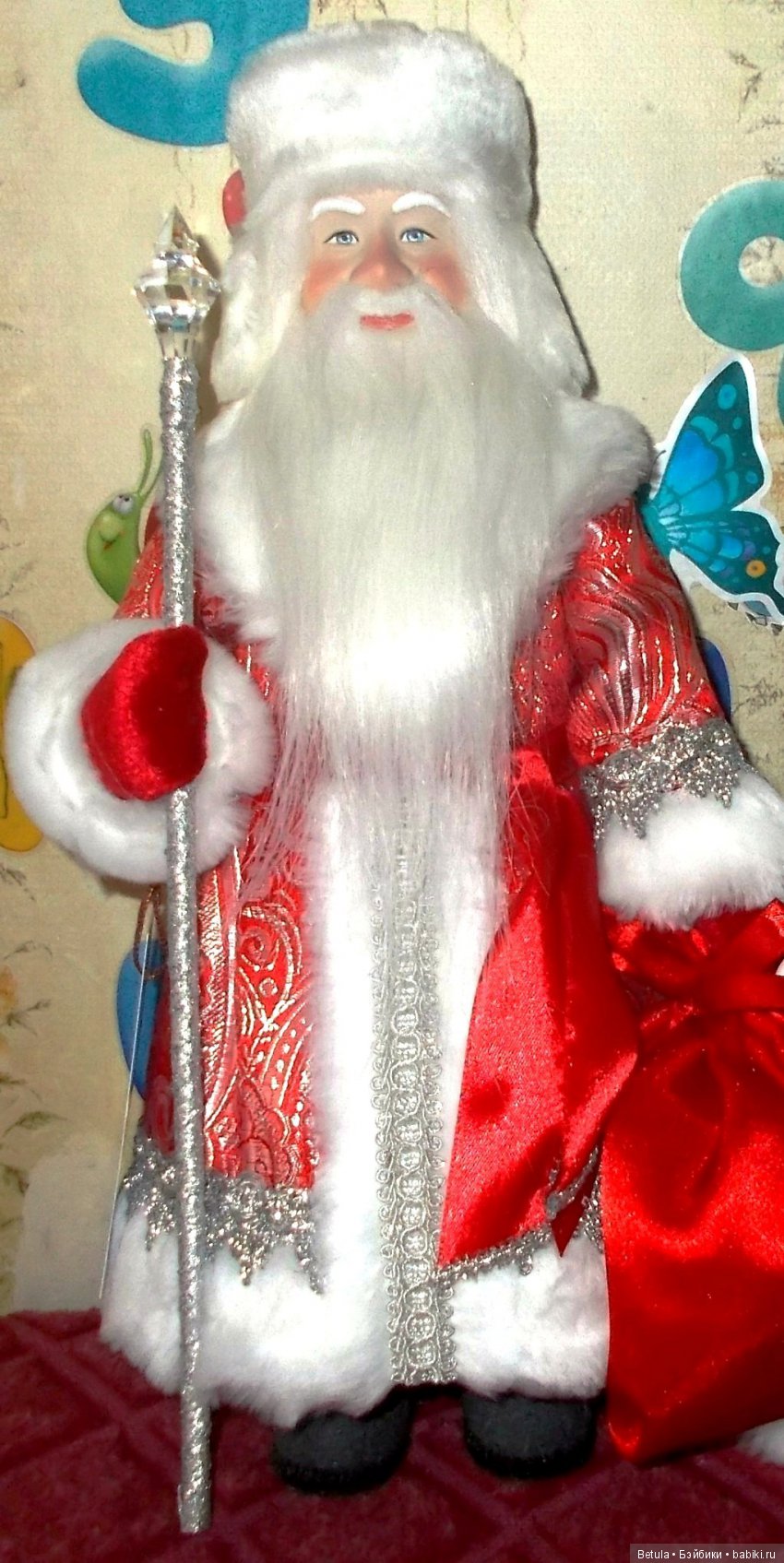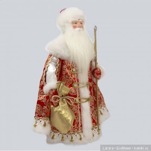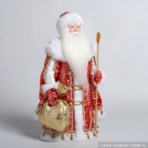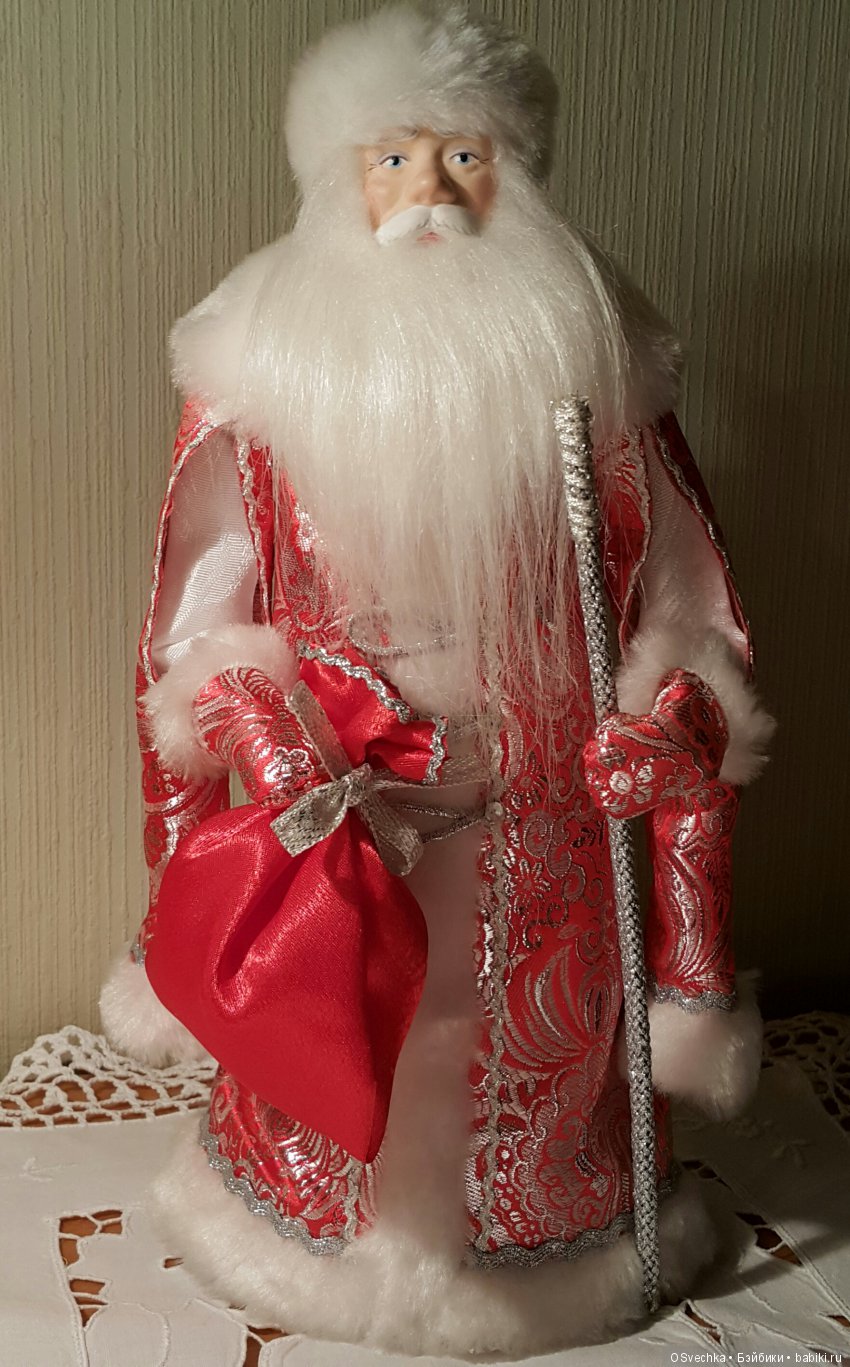 Сделан дедушка с душой и очень добротно! Фарфор, парча, ткани, искусственный мех. Даже посох обернут текстильным жгутом. Пуговки и снежинка на посохе — пластик (его минимум).