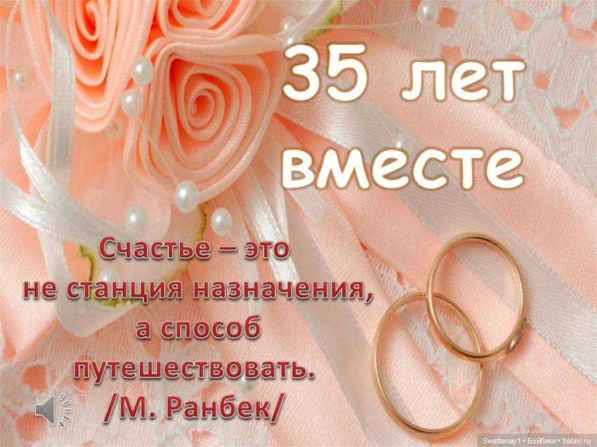 Супружеская пара все с тем же упорством движется вперед, и сегодня у них очередной праздник, не просто годовщина, а тридцатипятилетний юбилей совместной жизни. Сколько же надо иметь любви, а для некоторых и терпения, чтобы пройти друг с другом столь значительный отрезок жизни. Чего только не было за эти годы и страсть, и ненависть, и слезы, и смех. Все трудности, что встречалось на пути супругов, помогли сделать их союз более прочным и гармоничным. Они наверняка воспитали и вырастили ребенка, а быть может и не одного, передав ему всю свою теплоту и любовь, которая долгое время синтезировалась и вкладывалась в сознание потомка. Сегодняшнее торжество дарит прекрасный повод и возможность, чтобы оглянуться в прошлое и освежить в памяти, как начиналась вся эта история.