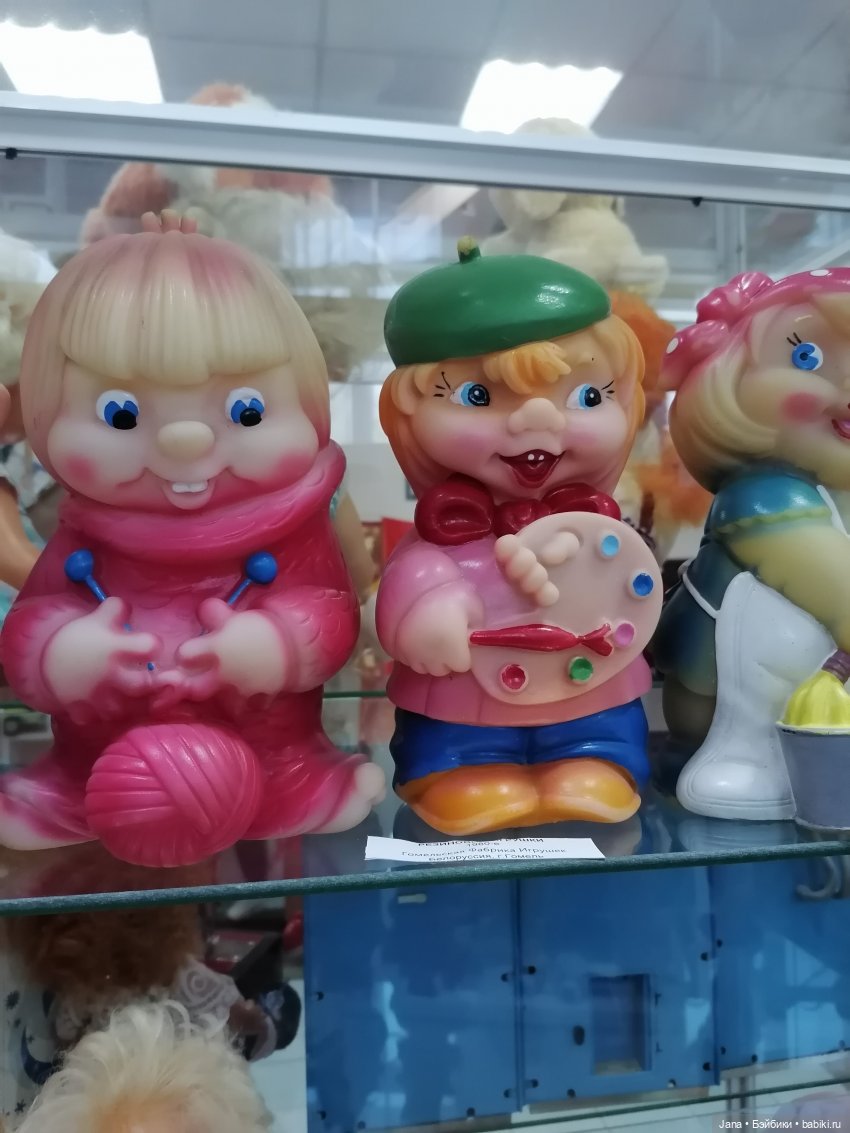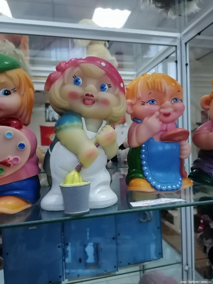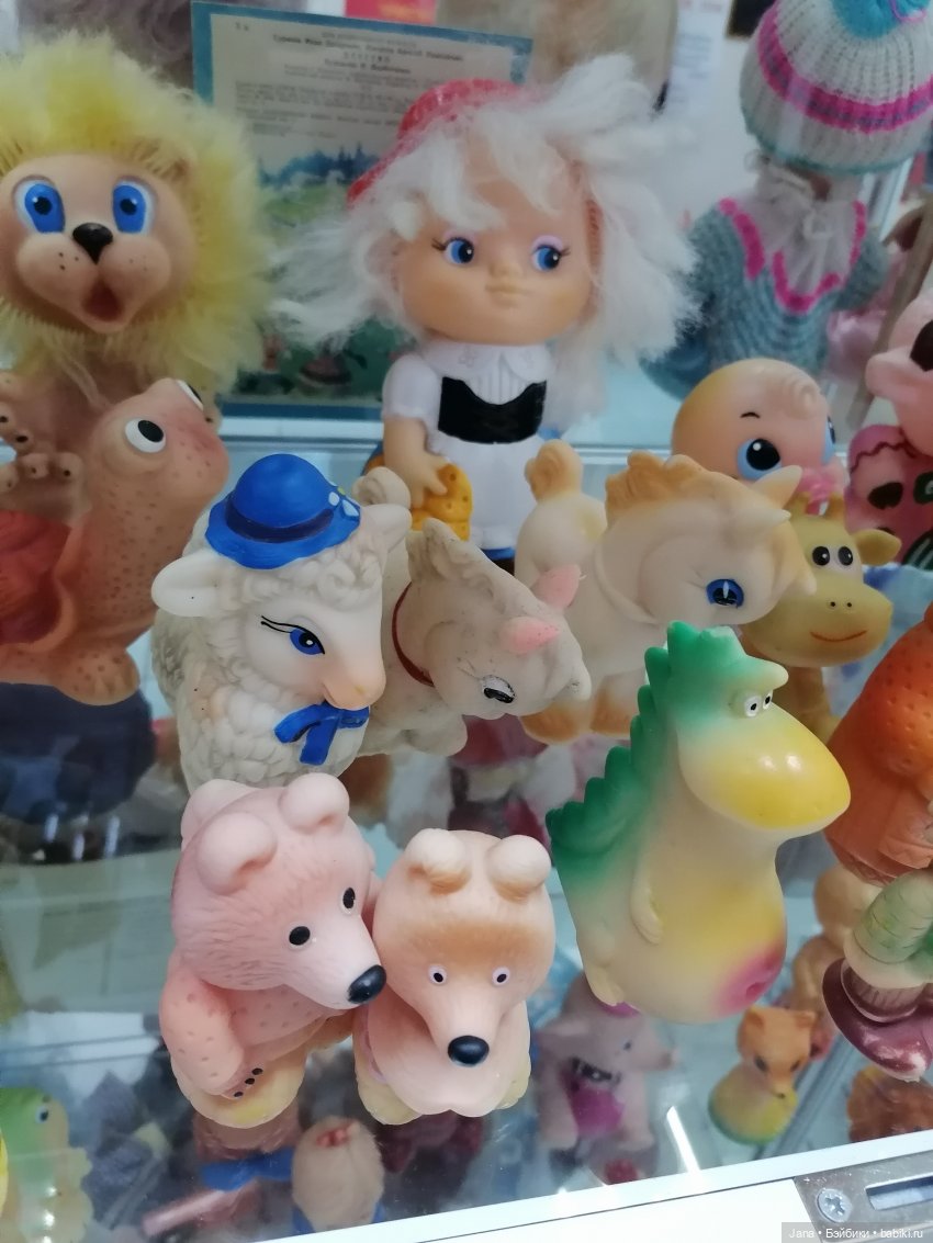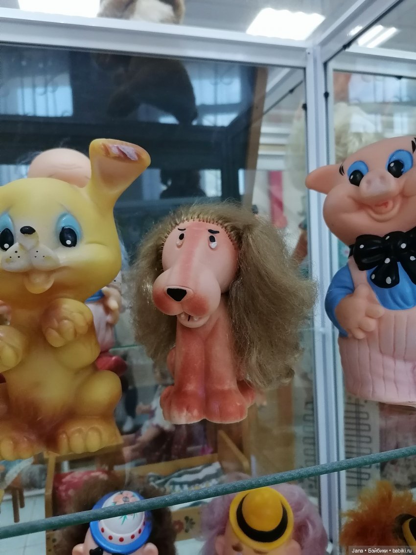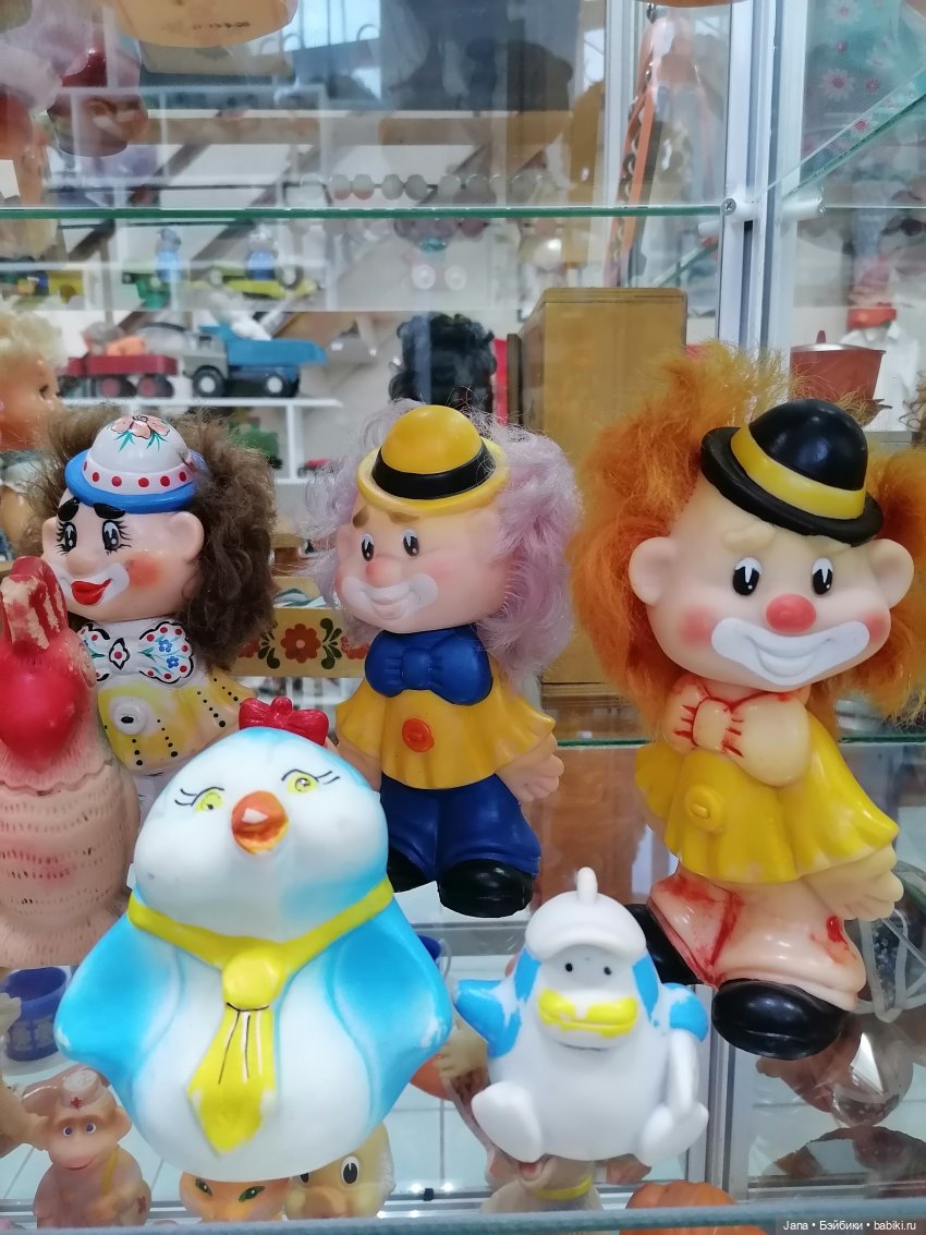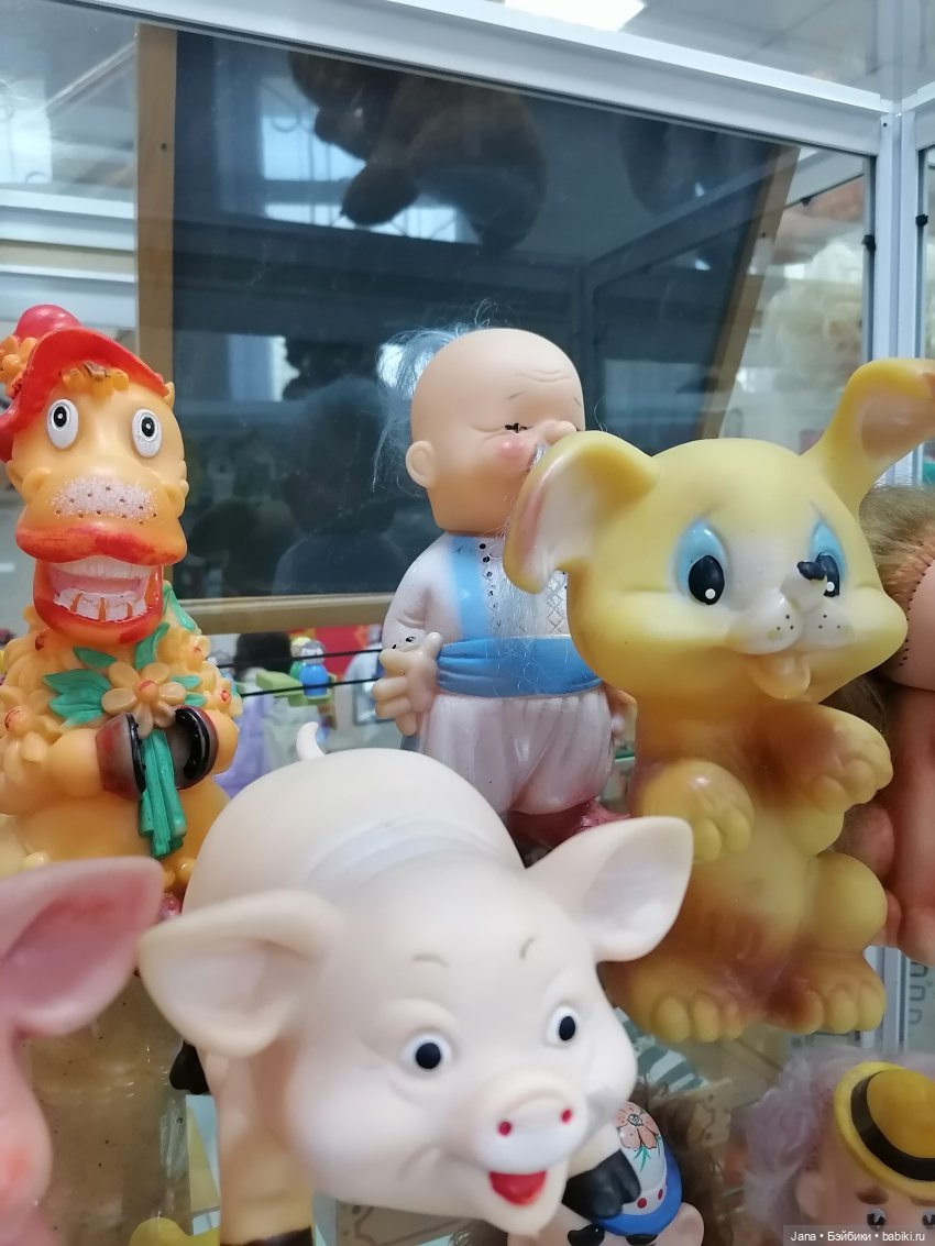 Кошмарная резина 90х, дутыши 80х вторичных фабрик, куклы тоже тех же годов. Некоторые игрушки в состоянии не для выставки — облупились, дружба народов например, или выгорели, несколько больших полиэтиленовых в ужасном состоянии, как с мусорки. Они не редкие и дешевые, можно было получше найти. Куклы лохматые.
