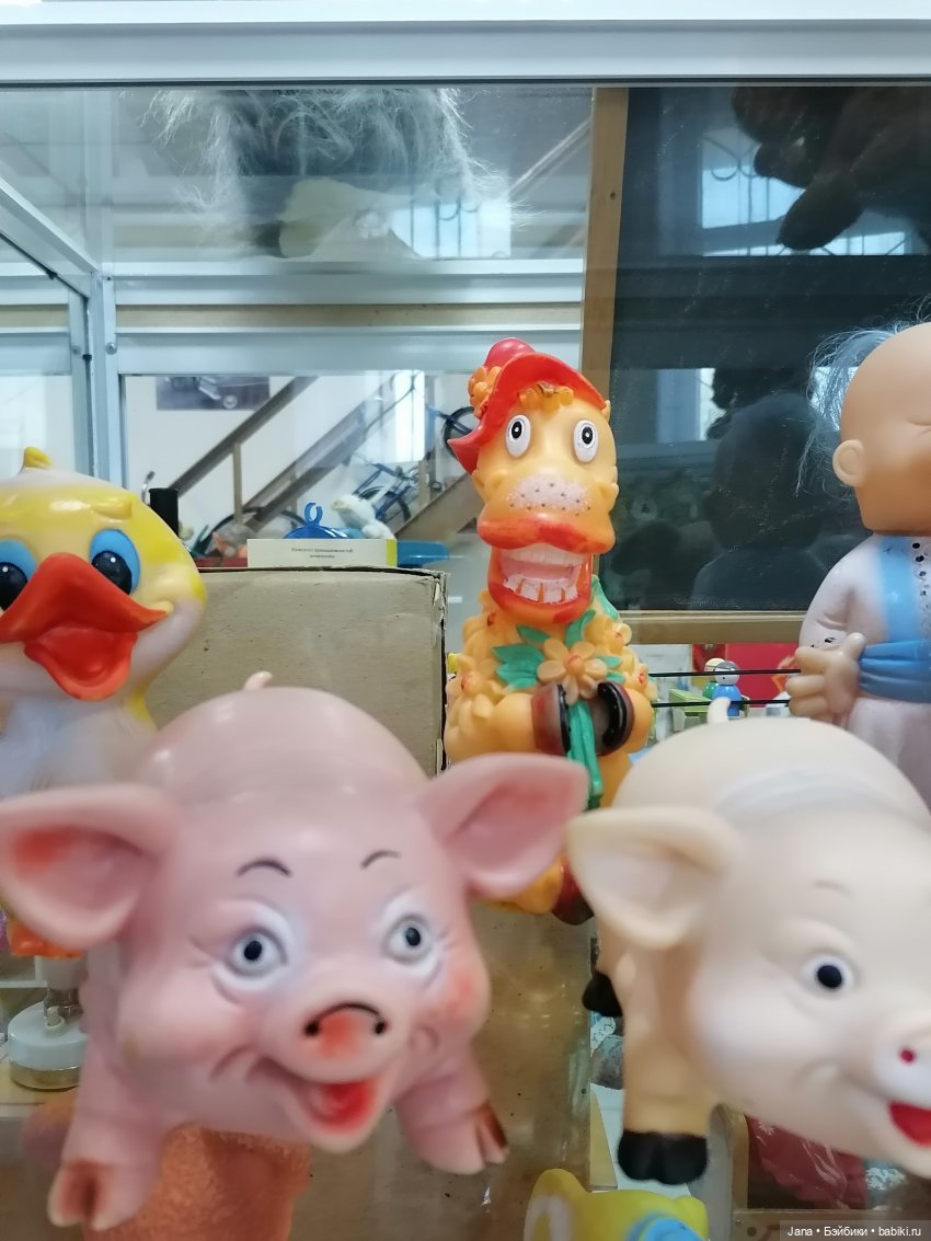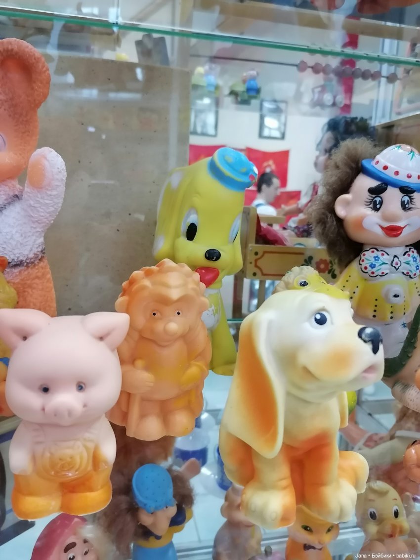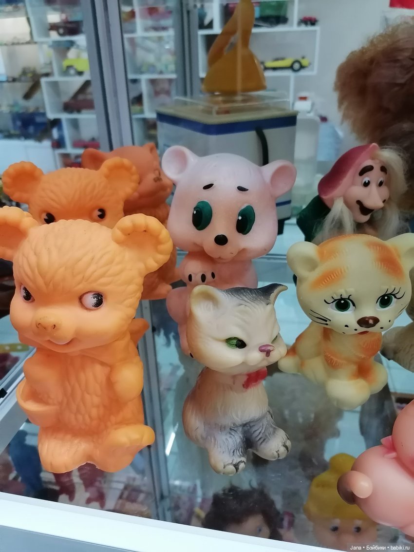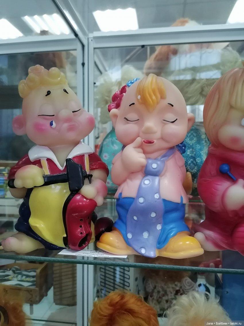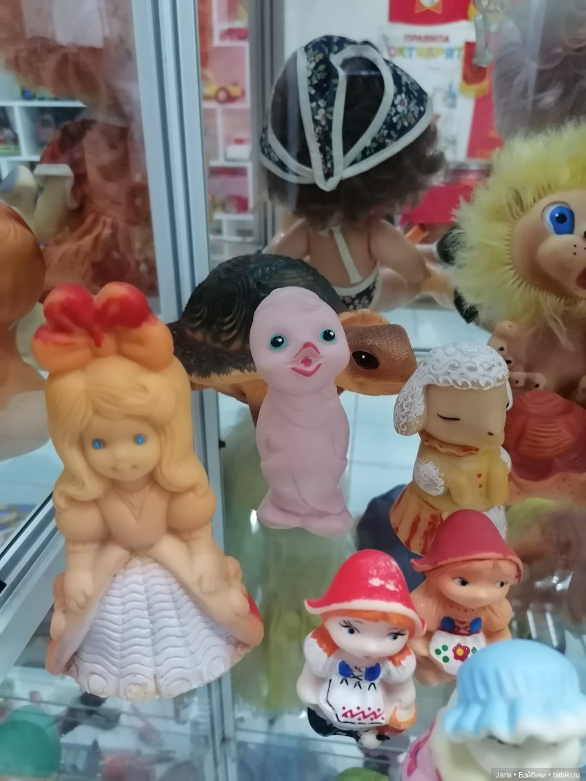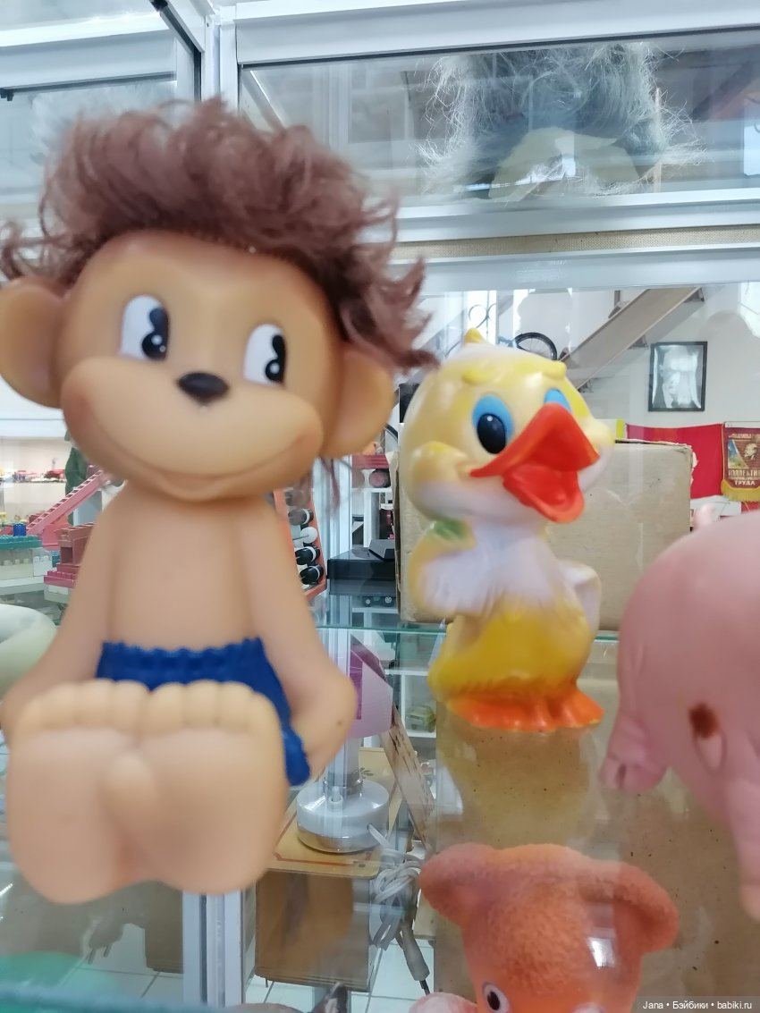 Кошмарная резина 90х, дутыши 80х вторичных фабрик, куклы тоже тех же годов. Некоторые игрушки в состоянии не для выставки — облупились, дружба народов например, или выгорели, несколько больших полиэтиленовых в ужасном состоянии, как с мусорки. Они не редкие и дешевые, можно было получше найти. Куклы лохматые.