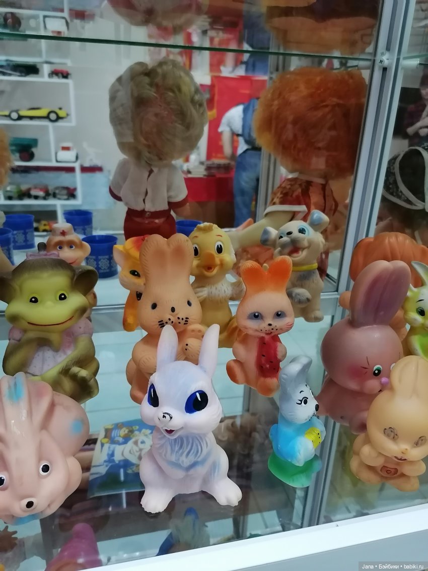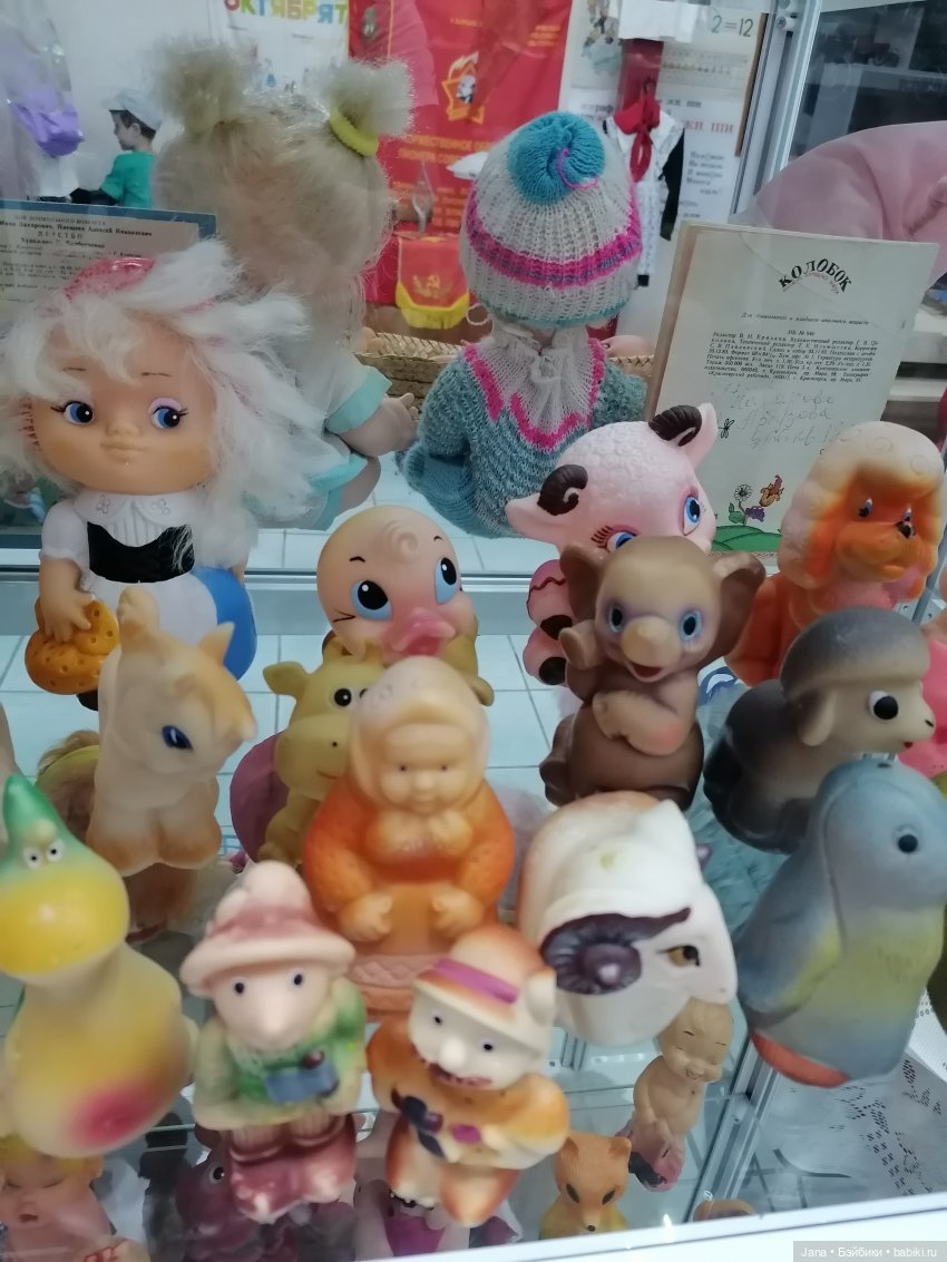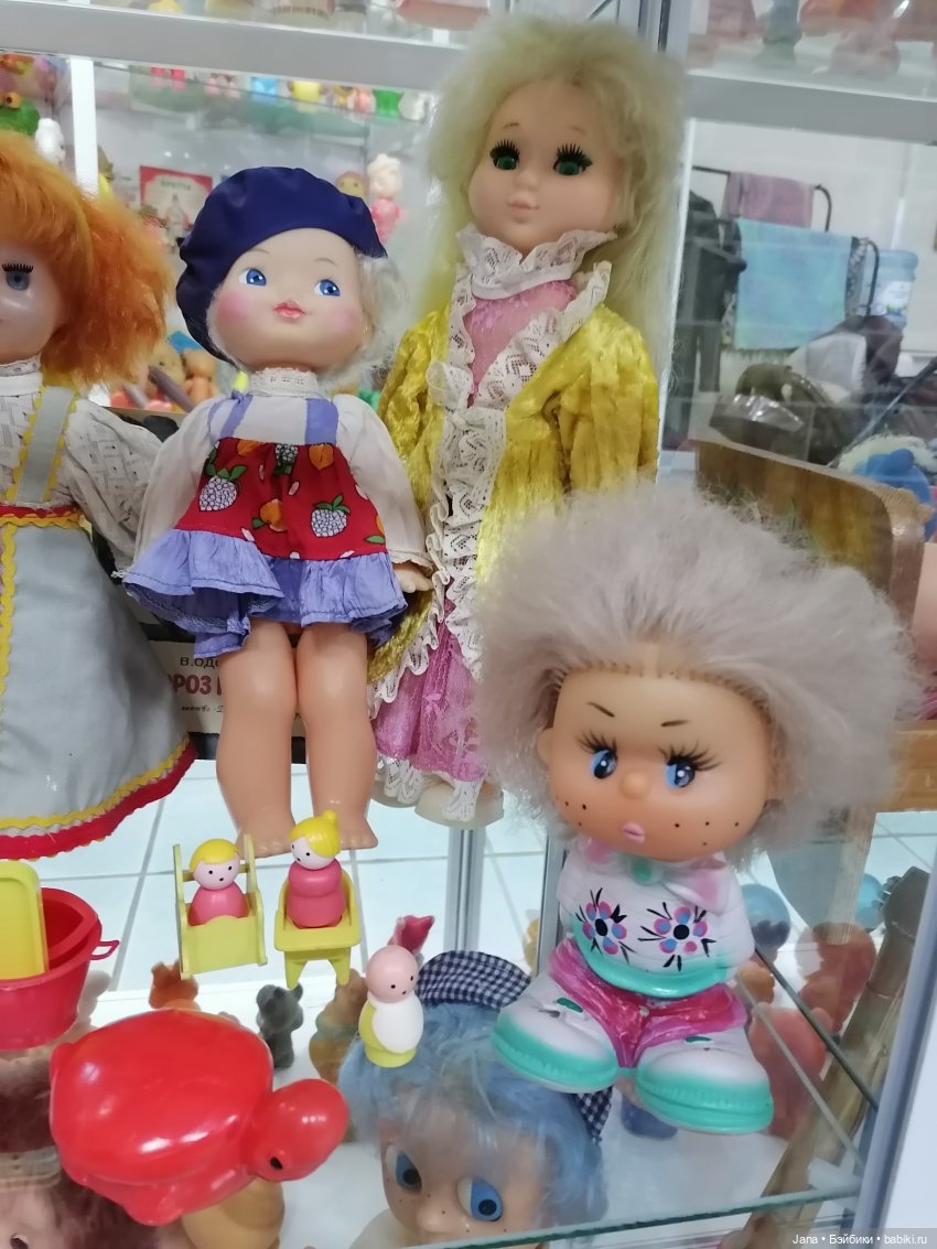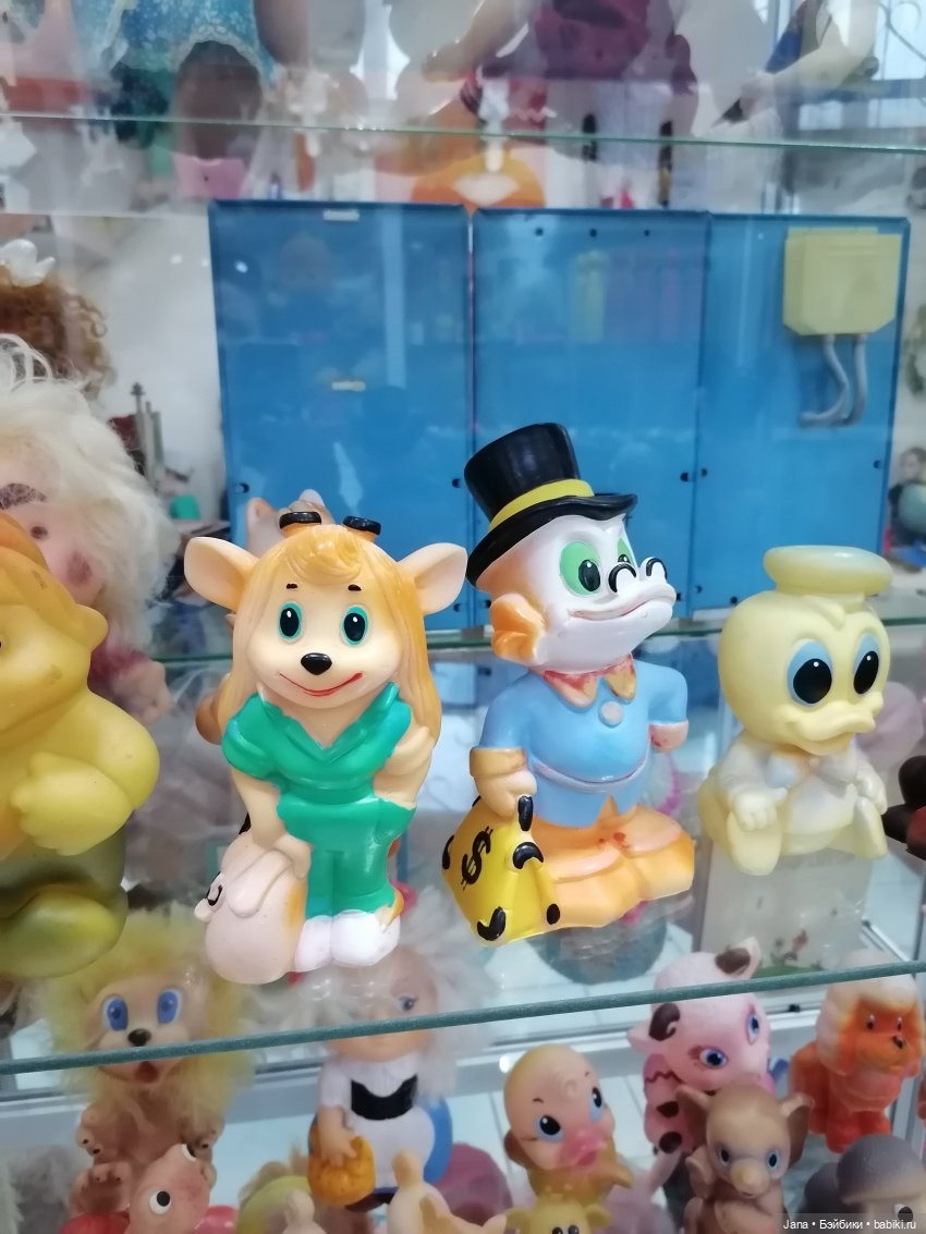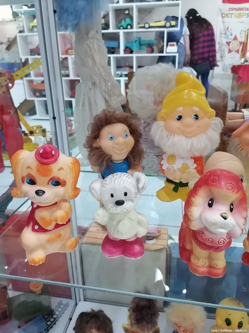 Кошмарная резина 90х, дутыши 80х вторичных фабрик, куклы тоже тех же годов. Некоторые игрушки в состоянии не для выставки — облупились, дружба народов например, или выгорели, несколько больших полиэтиленовых в ужасном состоянии, как с мусорки. Они не редкие и дешевые, можно было получше найти. Куклы лохматые.