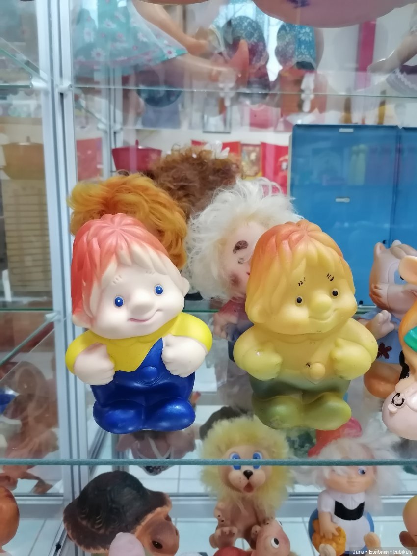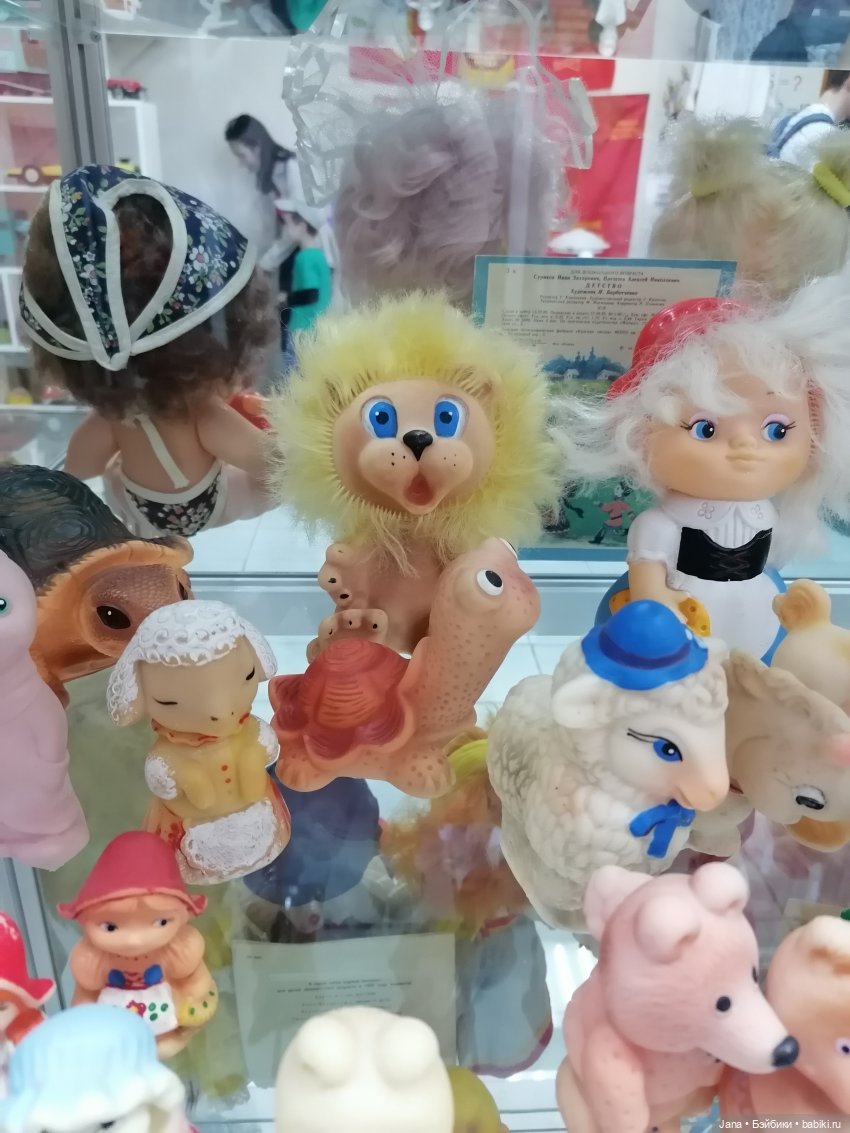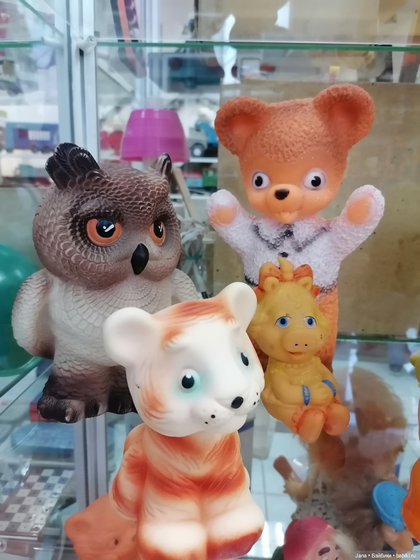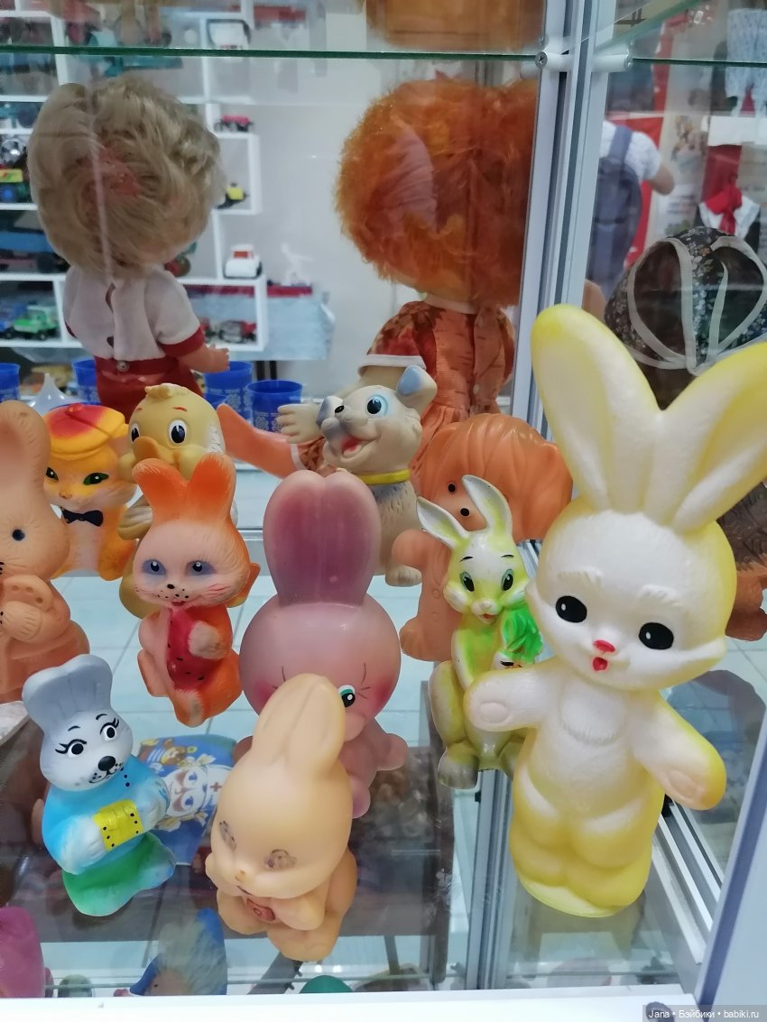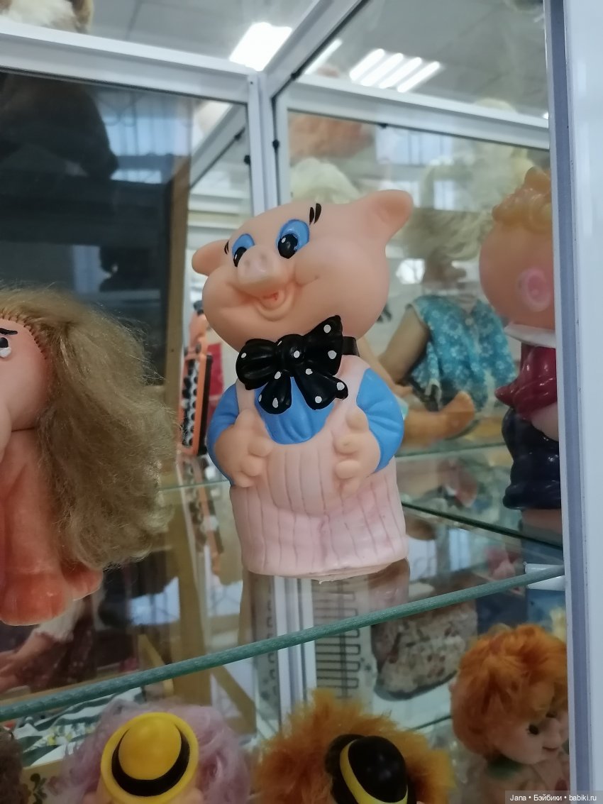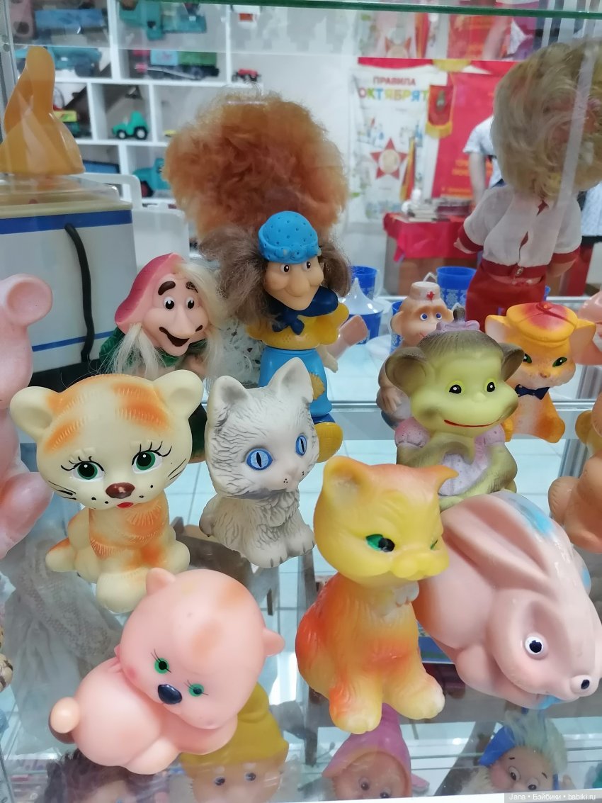 Кошмарная резина 90х, дутыши 80х вторичных фабрик, куклы тоже тех же годов. Некоторые игрушки в состоянии не для выставки — облупились, дружба народов например, или выгорели, несколько больших полиэтиленовых в ужасном состоянии, как с мусорки. Они не редкие и дешевые, можно было получше найти. Куклы лохматые.