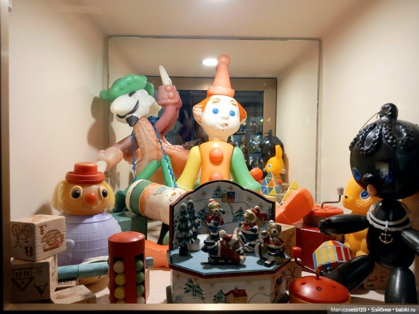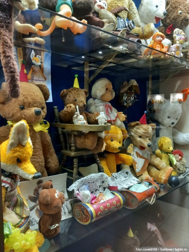 И я, посетив это место, не стала исключением, ведь столько знакомых и дорогих сердцу игрушек смотрели с витрин. Взгляд на каждого вызывал бурю тёплых чувств и эмоций. — Вот об этой куколке я всё детство мечтала.., а этот был любимчиком моей лучшей подруги в детском саду… А вот этот мишка был у нас с сёстрами и моя сестра Марина пугала меня его (как мне казалось) устрашающим рыком, утверждая, что медведь живой и меня съест, если не буду убирать за собой игрушки.