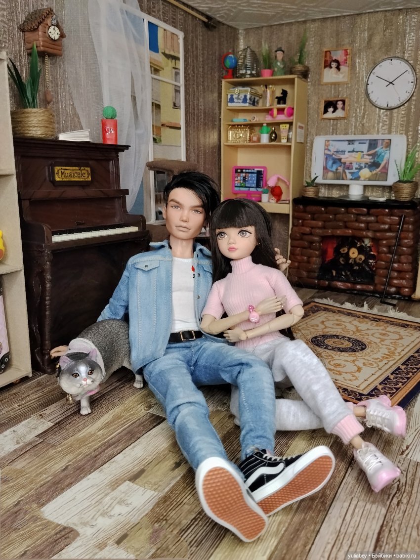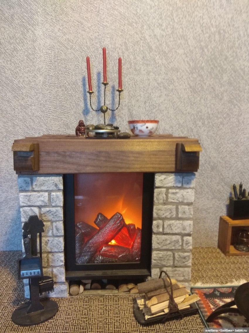 Камин что на заднем плане я слепила из кирпичей, сделанных из воздушного пластилина.