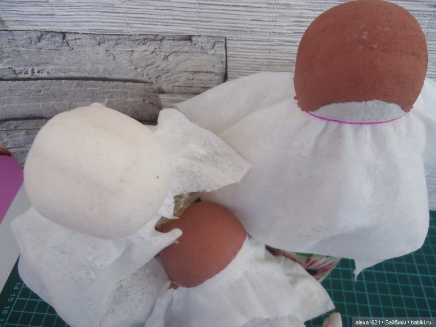 Три слоя — сначала пищевая пленка, которую надо зафиксировать резиночкой на шее у куколки. Второй слой — салфетку сформировать по голове, вытягивая-растягивая распределить по головке, чтобы не было складочек и закрепить резиночкой. Нанести клей ПВА. В роликах я видела то, что используется столярный ПВА. У меня обычный… Третий слой еще раз салфеточка (только теперь я ее укладывала перпендикуляно предыдущему слою) — и опять клеем по ней прошлась. Между этими слоями делала небольшую временную паузу, чтобы второй слой немного подсох. У меня были шкурки с темным серым мехом, поэтому голову прокрасила темной краской смешала гуашь и водоэмульсионную краску-шестёрку (другой у меня не было, а специально покупать не стала). И все — процесс пошел после того как все высохло, у меня это получилось на следующий день.