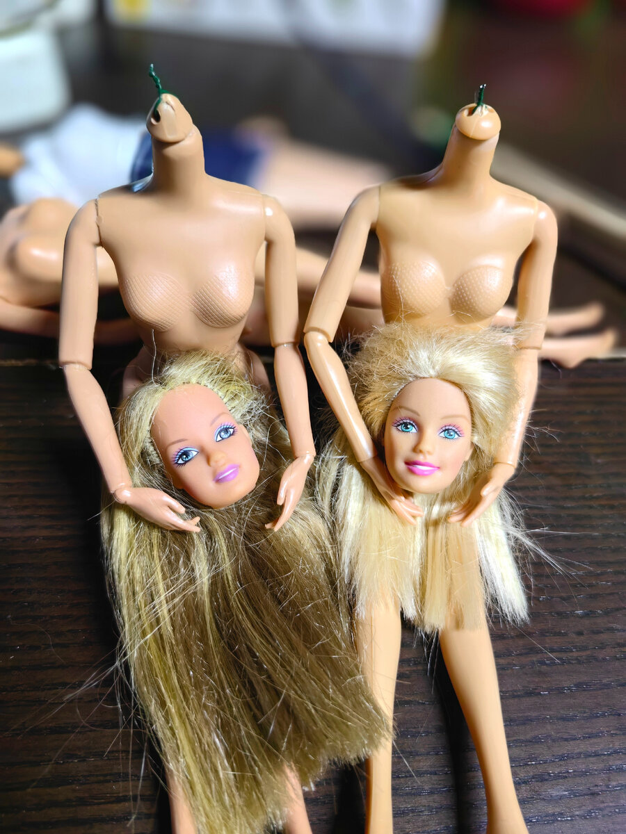 Кроме того, есть у меня еще одна «пациентка». Моя личная персональная сломанная Барби, как из одноименного фильма))) Она в общем-то целая, но волосы испорчены частично. Покрутила я ее в руках, ладно, думаю, дадим шанс «человеку». Для нее полным совпадением скинтона оказалось тело от куклы Софии. И вот они наши пациентки сегодняшнего дня: