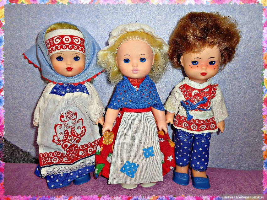 На мой взгляд, вы очень хорошо отремонтировали всех кукол, фасон одежды я бы подбирала в духе СССР (хотя на многих ваших куклах и так такие наряды, только прошить некоторые на машинке осталось), можно поискать фото кукол в родной одежде и сшить что-то подобное.