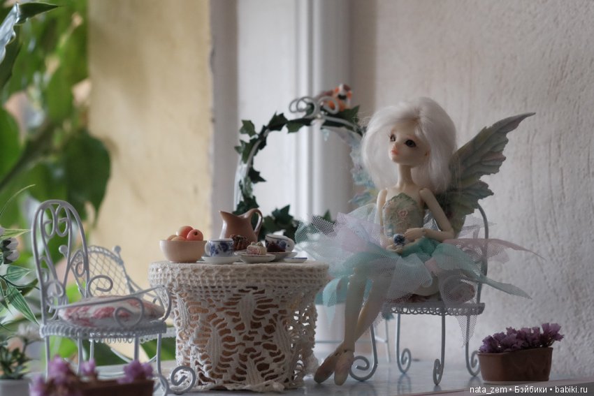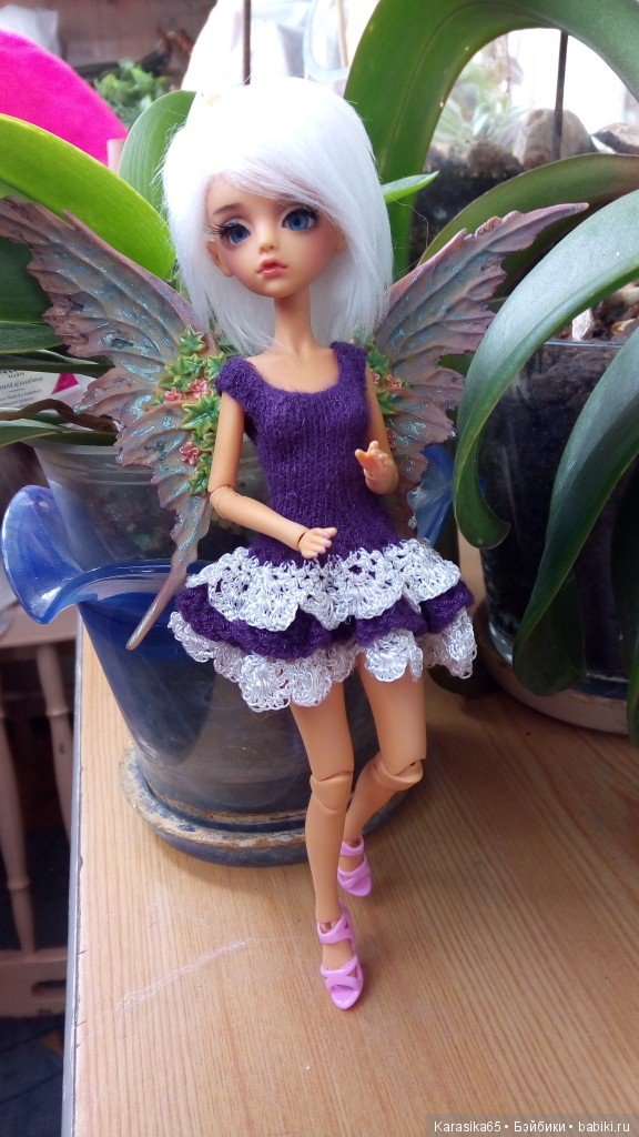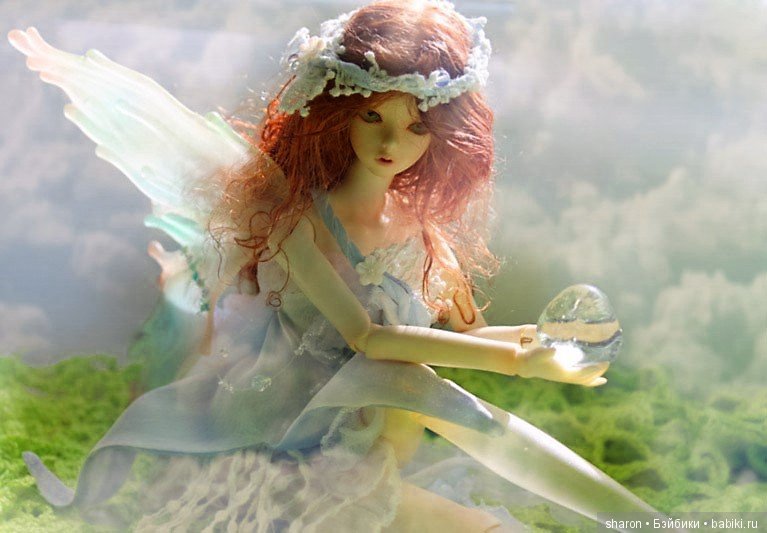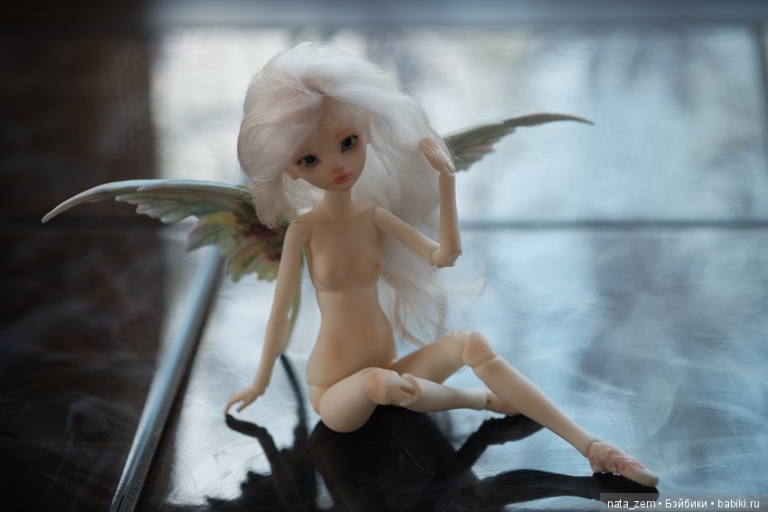 Примерно год назад, просматривая на ютубе распаковки БЖД, случайно наткнулась на распаковку неизвестной мне девочки-бабочки. Куколка была с алиэкспресс, т.е. бутлег, но в тексте упомянули, что оригинал выпускает фирма Dollzone. Даже эта подделка поразила меня изяществом форм, но главное — это крылья! Большие и в то же время легкие, с «рваными» краями и прекрасно вылепленными цветами и листьями… Казалось, Бабочка сейчас взмахнет ими и улетит… В общем, мне очень захотелось, что бы эта Бабочка прилетела и в мой сад :-) Ни на что особо не надеясь, зашла на сайт фирмы Dollzone и… нашла свою бабочку! К счастью, кукла была в продаже и мне оставалось только найти посредника. На бжд-клабе нашлась коллективка. Головку взяла от другой девочки из этой серии, она мне понравилась больше и не удержалась от покупки «балетных» ножек (давно о них мечтала :-)). Сомневалась, брать ли фулсет, но решила, что все же очень хочу сделать свою, не похожую на других Бабочку… Оплатила заказ и села ждать… Сроки ожидания у этой фирмы довольно приличные (примерно пол-года) и я уже успела забыть о своей покупке как вдруг получила сообщение о том, что девочка уже у посредника. Дальше события развивались очень быстро. Когда девочка приехала ко мне, до окончания дачного сезона оставалась всего пара выходных, а так хотелось снять ее, порхающей по моему саду… В общем, мейк вместе с блашем крыльев я сделала за один день, хотя даже не представляла, что хочу получить в итоге. Видимо, девочка сама подсказывала мне, что делать :-) Парик смастерила из купленного в Куклобазе жемчужно-белого тресса. Оставалось самое сложное для меня — одежда. Честно сказать, ну не швец я :-( Благо, при таком размере можно и не шить :-) Так что костюмчик я скорее «смастерила» :-) «Фасончик» юбки подсмотрела у Доллзона, а топик вырезан из подходящего кружева. Юбку дошивала уже на даче, так что в первый день фотографировала Бабочку без одежды :-)