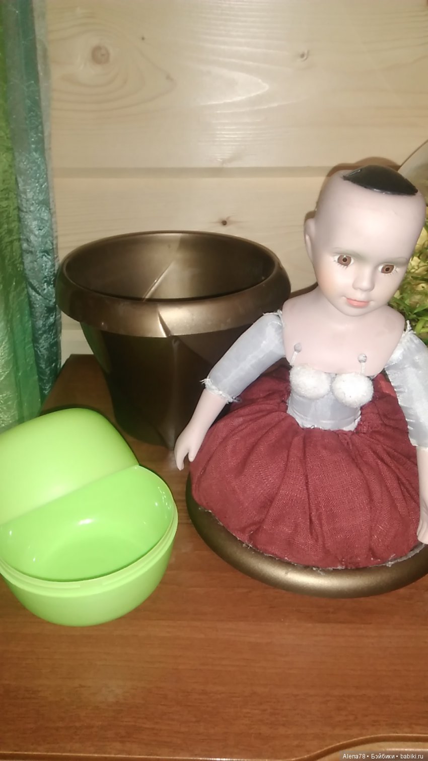 Рядом для примера сфотографировала шкатулку которую делаю сейчас. Китайскую фарфоровую куклу по запчастям отдали, а основа будет пластиковое кашпо для растений.