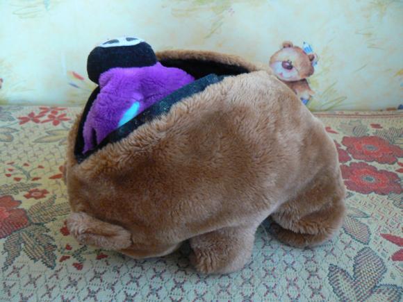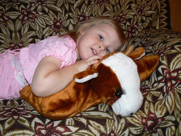 А у нас есть бегемот Гиппо -он на пуговице, если застегнуть — получается бегемотик, растегнуть — подушка…