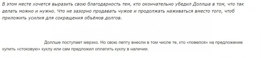 Я ни разу не написала, что покупатели чужих заказов — мошенники. Нет такого. Безусловно, мошенник тут только Доллше. Но покупать товар, заведомо зная, что это чужой заказ, тоже не очень… порядочно. А что продаются чужие куклы — это знали и понимали все, кто в теме БЖД. Кто бы сейчас что ни говорил. Потому что тут все работают строго по предоплате. С БЖД всегда так. А на момент открытия этой стоковой распродажи, о многолетних долгах Доллше перед заказчиками писали много раз и на всех площадках.