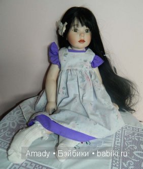Это виниловая твердонабивная кукла с широкой грудной пластиной в которую вставлены голова(может поворачиваться и наклоняться в любую сторону) и руки(так что она может носить совсем открытые платья и сарафаны), ножки 3/4 винила, в верхней части ног проволочный каркас. Ее рост составляет 24 дюйма или 61 см. Ножки согнуты, так что видны прекрасно проработанные коленочки, которые являются отличительной чертой этого автора. Ручки двигаются не только вверх и вниз, но и раздвигаются в стороны. На пальчиках рук и ног выполнен очень естественный маникюр. Подробности на фото:
