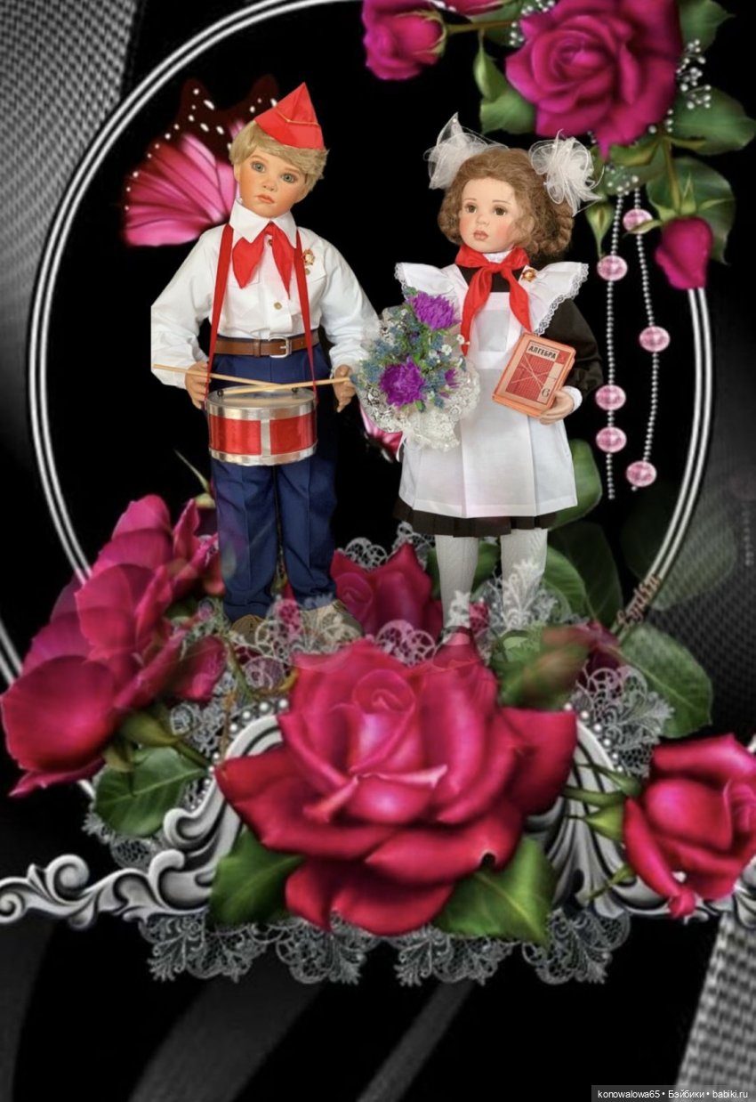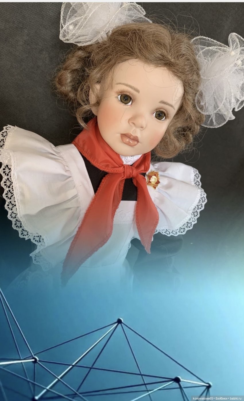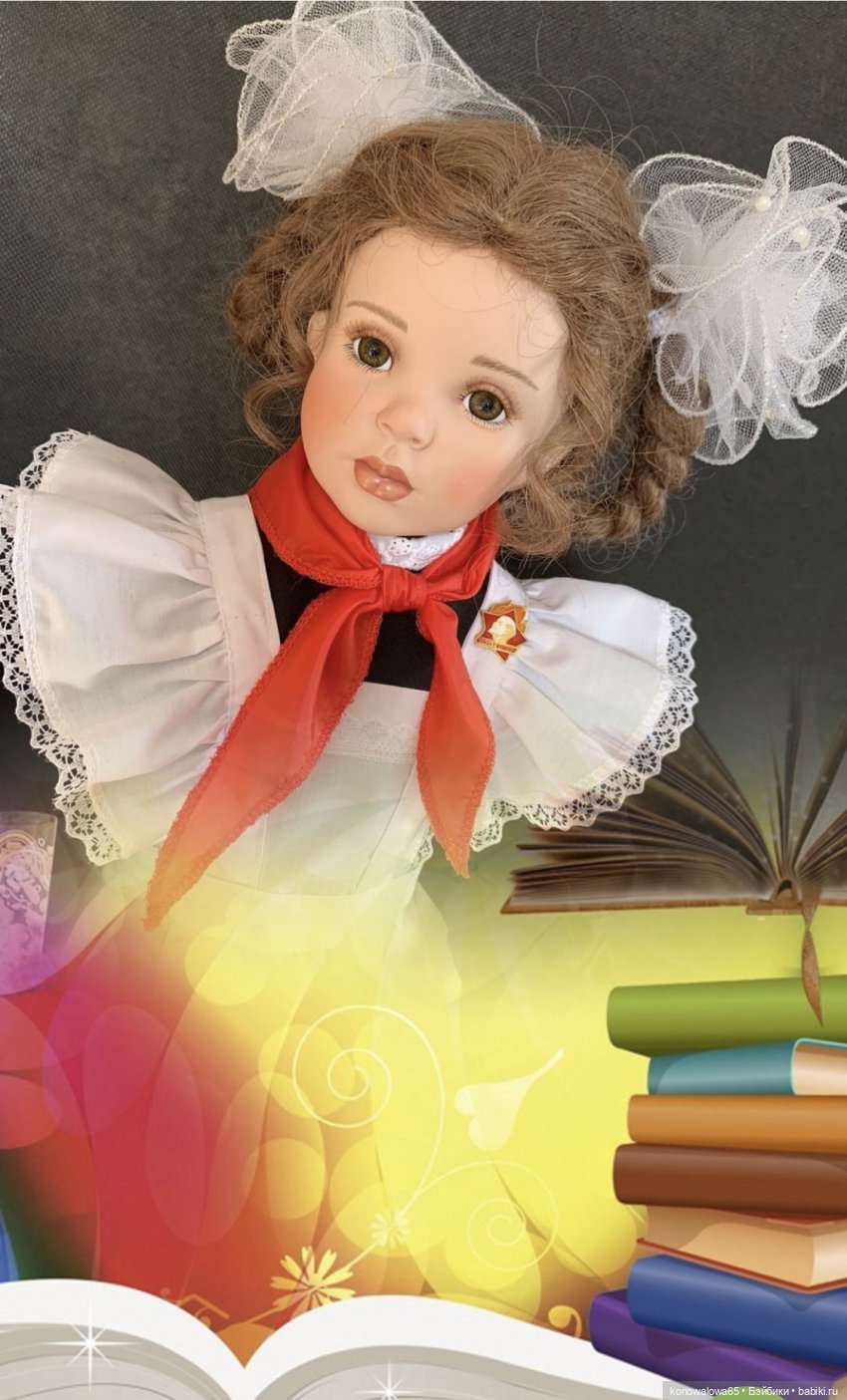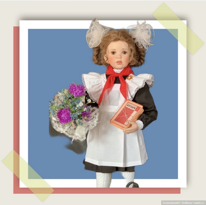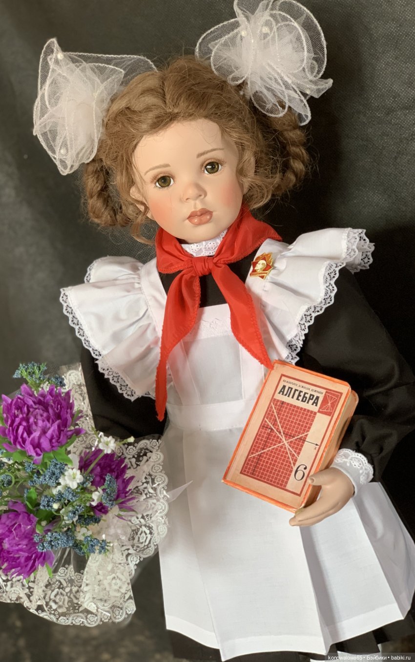 — Пионерка ( школьница) молд Джамайка. Д. Руберт, фарфор, рост 68 см, образ придуман и исполнен мной. Хочу сказать больше, у девочки вся одежда сделана,( как я носила в школе), сшита из шерсти и хлопка. Обратите внимание на цветы. Да, конечно же астры мы носили на 1 сентября, белые колготки или гольфы, ну и конечно банты!