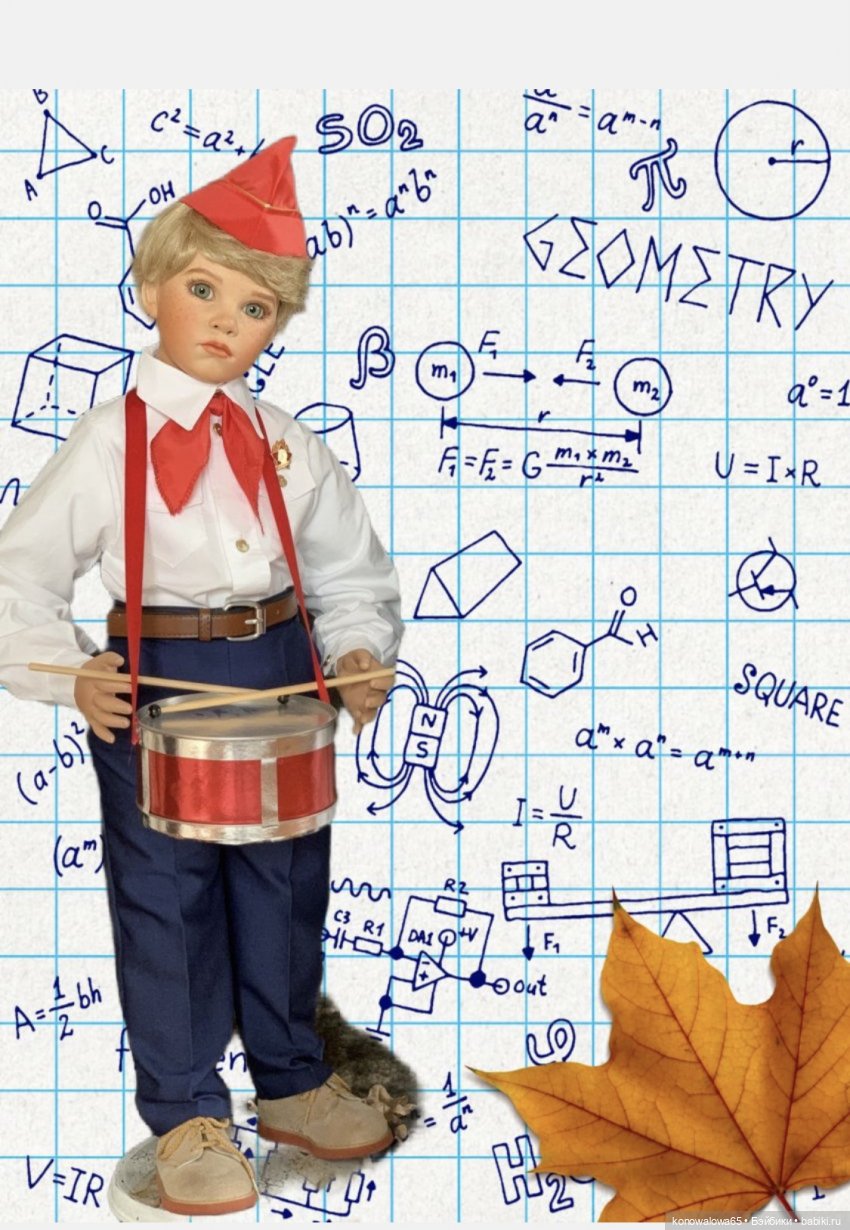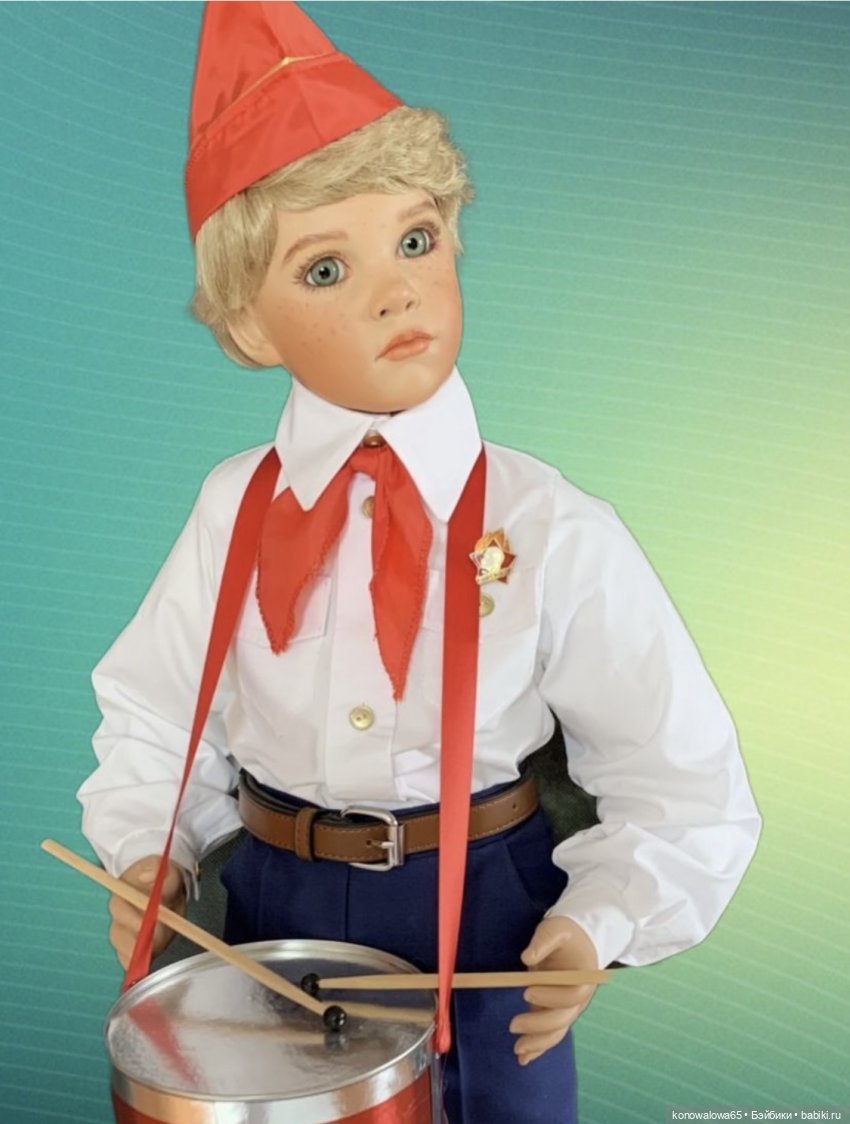 — Замечательный пионер (Сусси), автор Д. Ниссан, фарфор, рос 75 см, мальчик ООАК, расписан замечательным мастером Ириной Ткачевой, образ придуман и исполнен мной. Барабан сделан мной из банки печенья, горн не смогла придумать из чего сделать, может подскажете? А пилотки мы себе сами шили в школе, опыт большой