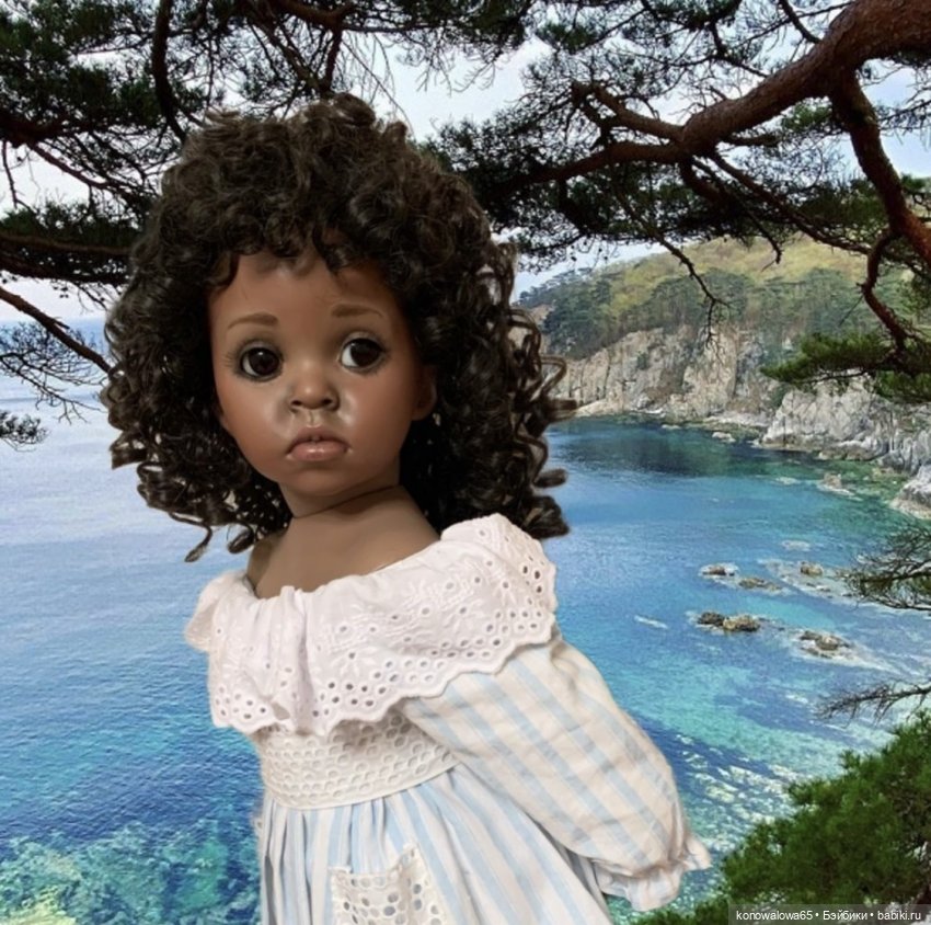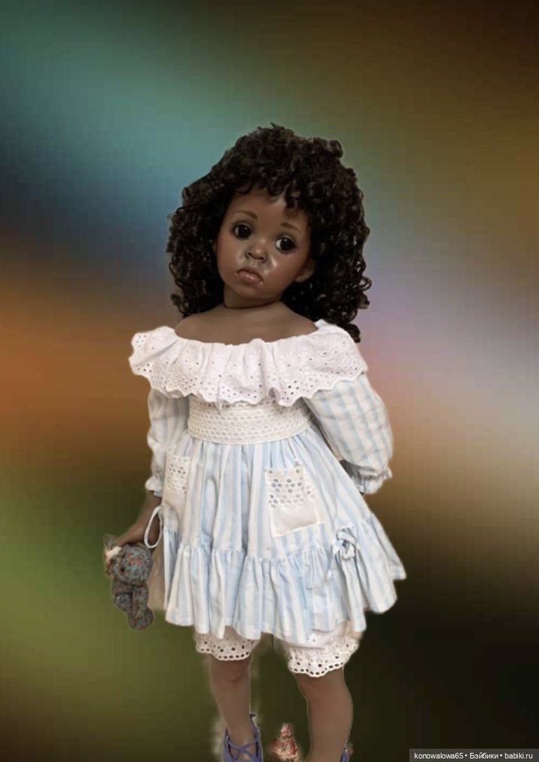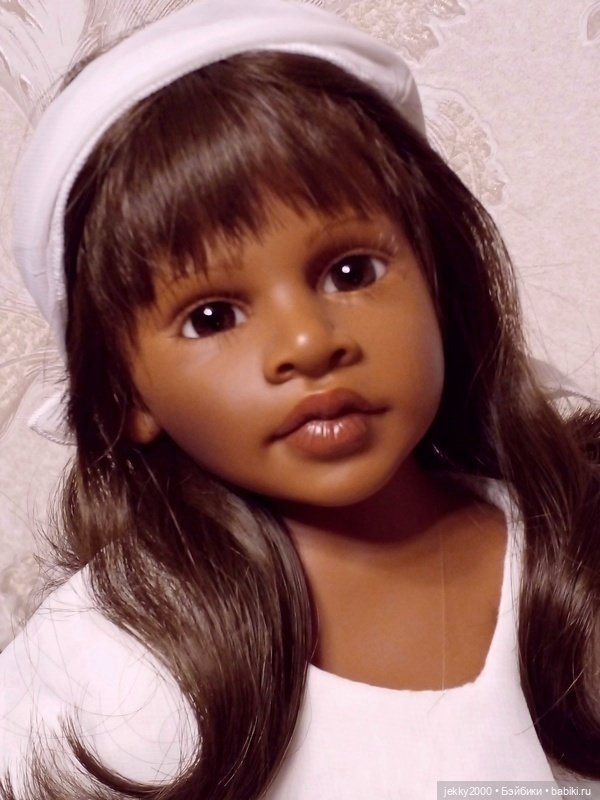 Девочка сделана Безупречно, потрясающая роспись лица, рук, ног, натуральные африканские волосы заплетенные в косички, тон фарфора выполнен превосходно, кукла на скелетном каркасе, занимает любые позы, очень реалистичные глаза( стекло)- чёрные бусинки