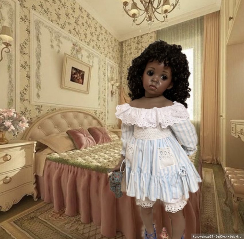 Эта девочка, одна из самых первых моих кукол причём, купила я ее не обдуманно и спонтанно, а когда получила — просто влюбилась в неё! Много раз, мне предлагали продать ее, но у меня и в мыслях не было, что когда нибудь, я это сделаю. Как коллекционная кукла, она ценности для меня не представляет, но как кукла- это любимица. Скажу — просто МОЕ и все!