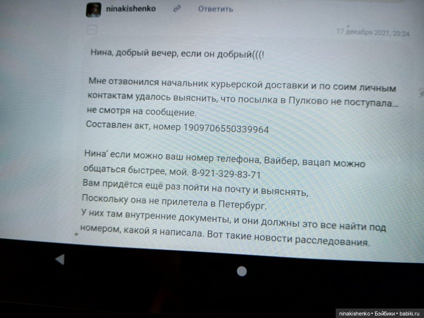 Есть момент который меня смутил, когда посылка застряла в Пулково, она сказала, что там работает знакомый начальник и она съездит попробует найти, потом сказала, что тот же знакомый сказал, посылка осталась в Ростове, для меня это не понятно, документы пришли, а кукла нет, последней трек с Санкт Петербурга, а теперь правда вышла наружу, куклу продают там же.