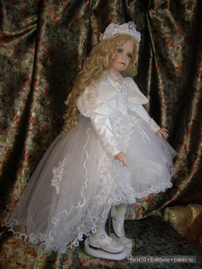Добрый вечер, Друзья! Недавно мою коллекцию пополнила долгожданная кукла-нежное и милое очарование-Принцесса от Донны Руберт. Очень благодарна Верочке (verara67) за мою ожившую мечту-СПАСИБО!!! Девочка просто восхитительная: нежно-розовый фарфор, вьющиеся волосы цвета золотистого блонда, большие голубые глаза, нежный румянец-и все это обрамляет потрясающий аутфит: фатин, атлас, бусины, пайетки, вышивка и наикрасивейшее благородное кружево. На ножках блестящие коготки и туфельки с блестками. Голова покрыта короной, плетенная из атласной ленты, расшитая бусинами. Интересная поза куколки: стоит на правой ножке, левая подогнута. Очень милое выражение лица красавицы-нежное с поджатой губкой! Моя куколка 153 из 900 шт выпуска прекрасного мастера Donna Rubert. Приятного просмотра.