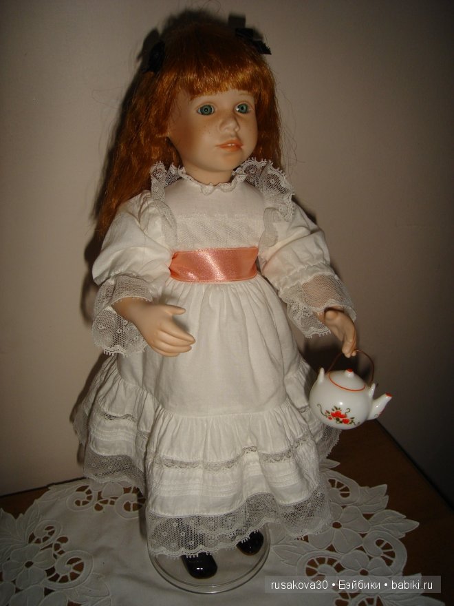 Добрый вечер, девочки. Хочу представить вам куклу из своей коллекции. «Tea with me» от скульптора Донны Руберт. Девочка бывает в фарфоре и виниле. У меня она в виниле. Выпущена была тиражом в 500 экземпляров. Наш номер 466. У девочки шикарные, большие голубые глазки — «Два голубых озера». Очень красивые чайничек чашка и блюдце. И конечно же очень красивый многослойный(колготы, панталоны, нижняя юбка и само платье)наряд. Расшитый золотой ниткой. Малышка приглашает вас на чай… и к просмотру фотографий. Спасибо что зашли в гости.