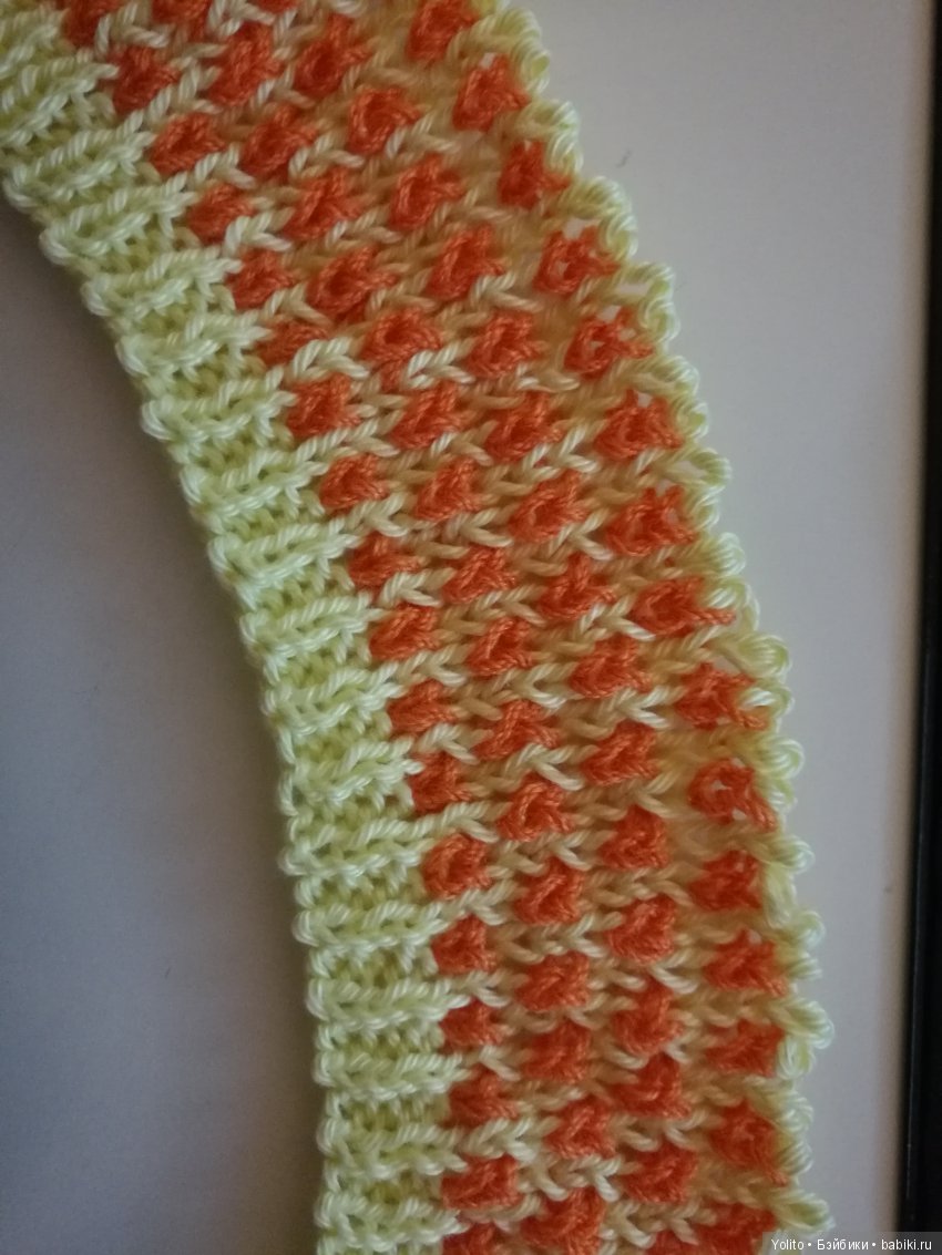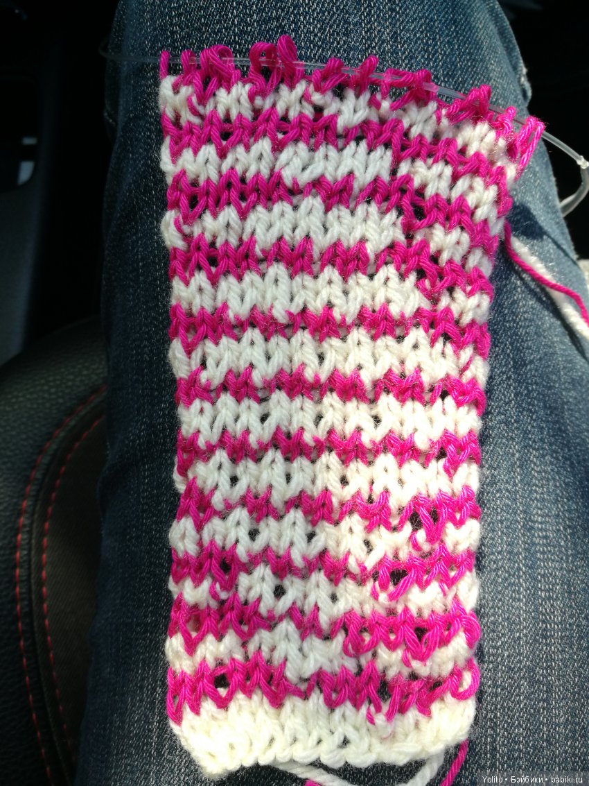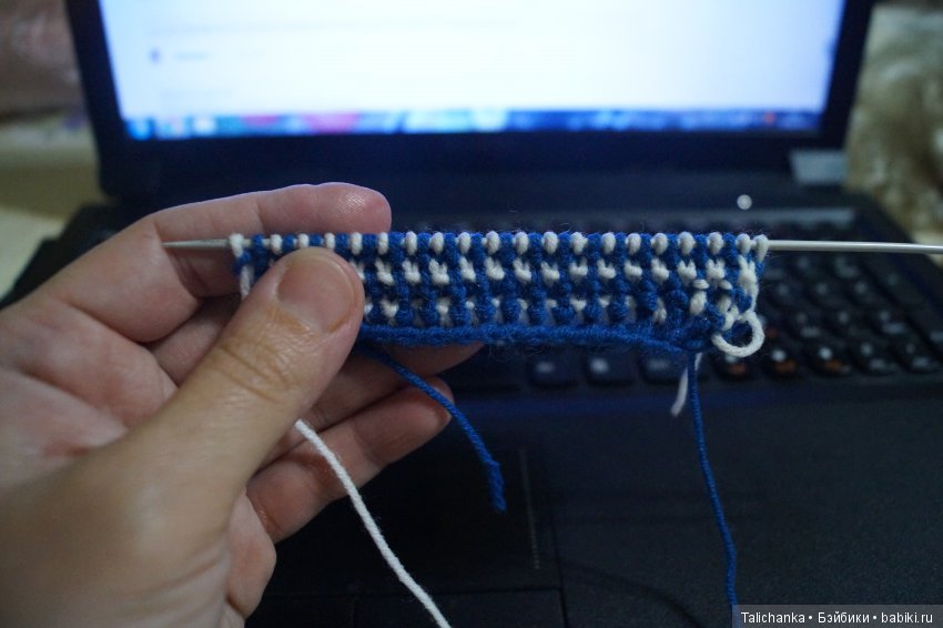 Мне кажется там все просто: вяжете 2ряда лицевыми петлями синей ниткой, следующие два ряда белой ниткой лицевой гладью три петли вяжете, четвертую снимаете не провязывая; 2 ряда синих лицевых все петли; 2р белых: 1бел, 1снять, 3 белых, 1 снять, т.е. снимаете синюю петлю над средней белой предыдущих рядов