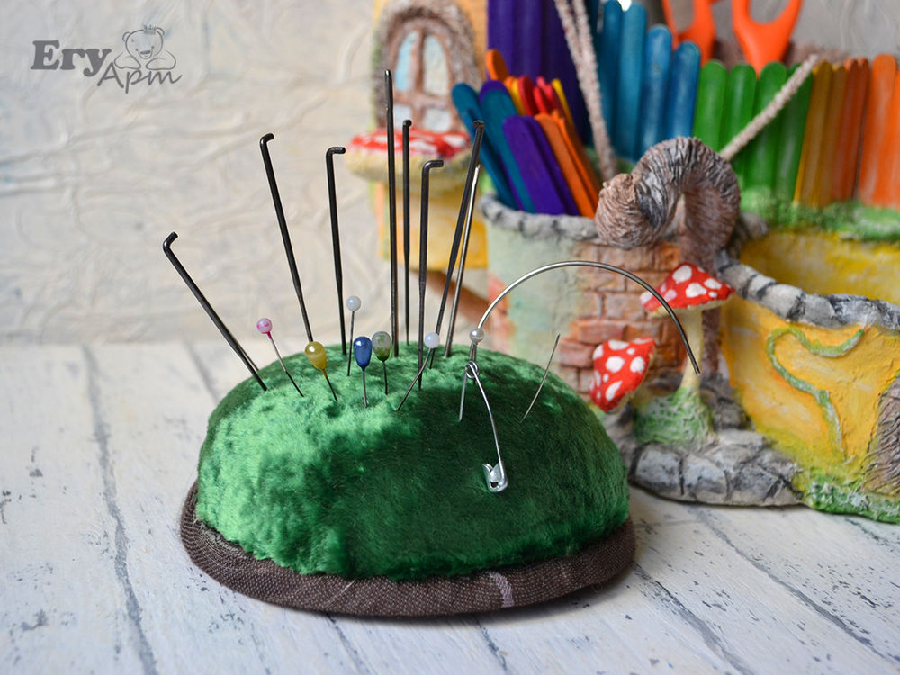 Крыша-игольница. Изготовила её из крышки от майонеза, картонки, поролона и обтянула кусочком плюша. Ведь у меня «Плюшевая страна» все персонажи сшиты из плюша и поэтому включила этот материал в композицию. Можно заменить фетром.