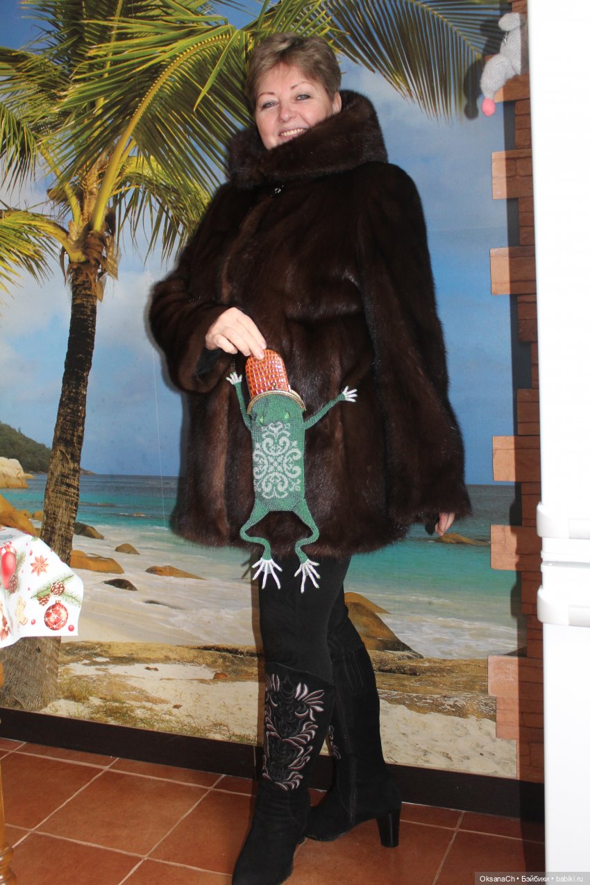 Связана крючком, с бисером. Английским способом. Бисер чешский, 2 оттенка, и третий цвет на самих пальцах. Подклад внутри — искусственная замша, цвет бежевый. Кружево вязанное, цвет «слоновая кость». Фермуар 10 см, цепочка 120 см, цвет «бронза». По размеру сумочка 10 см ширины, и 22 см длины (без учета лапок).