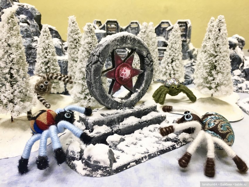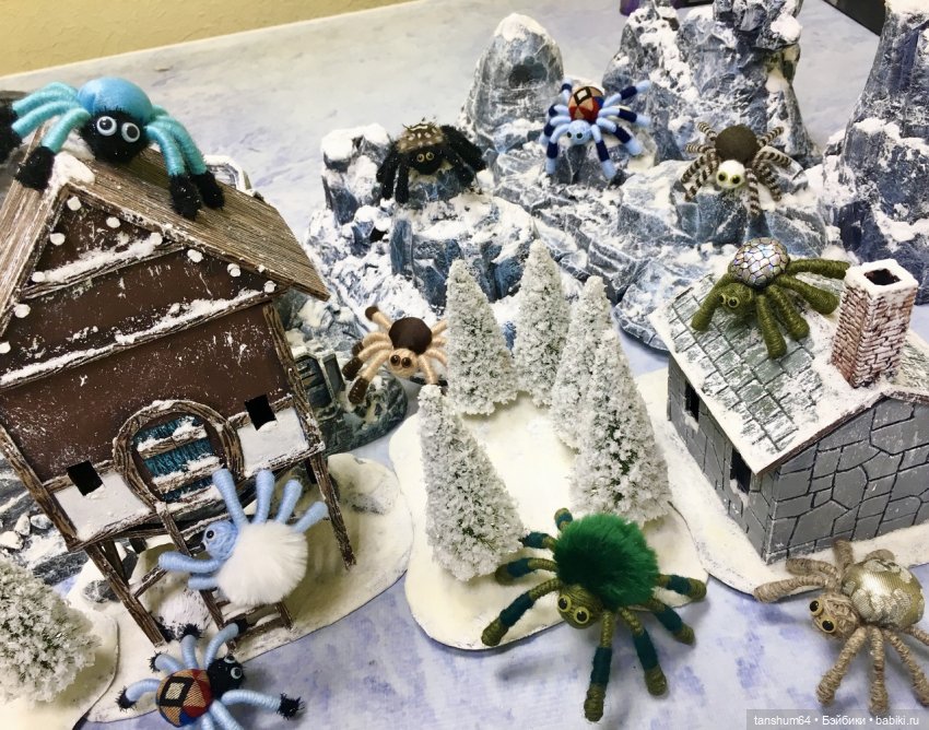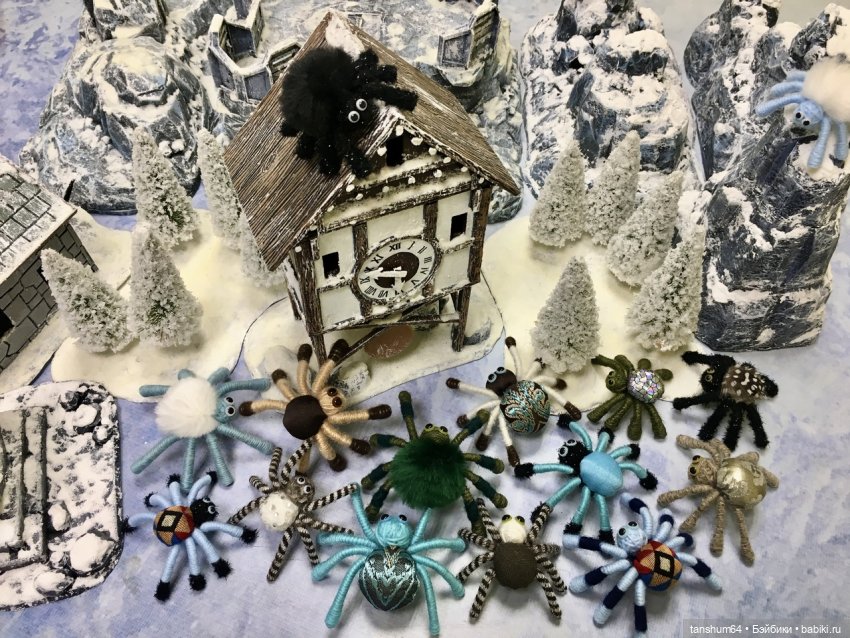 Доброго времени суток, дорогие коллеги по увлечению! Наверное, кто -то уже читал предыдущие топики о приключении замечательных паучат, созданных мастером Анастасией… Долго в её творческой мастерской не появлялось новичков с разноцветными спинками и многолапками. Но вот, творческое вдохновение, и наличие свободного времени, явило свету целую компанию очаровательных глазастиков. Однако, не успели они поселиться на приготовленной им пушистой паутинке из шерстяных ниток, как недавняя снежная буря, ворвавшись в открытую форточку, подхватила паучат, и понесла их вместе со снежными хлопьями далеко от дома…