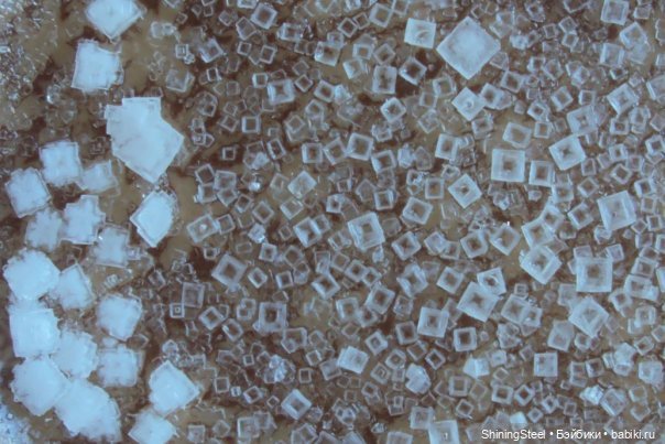А я поделюсь такой вот съёмкой на цифровой фотоаппарат 12 мпикс. Это большой (диаметр — около 12-15 см) химический стакан, в котором медленно высыхал раствор соли, и на дне образовались кристаллы) Снимала просто на режиме близкого расстояния