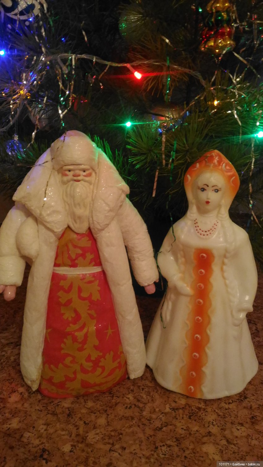 Решила обновить стареньких советских дедушку Мороза и Снегурочку. Разукрасила акриловыми красками и покрыла сверху лаком глянцевым.