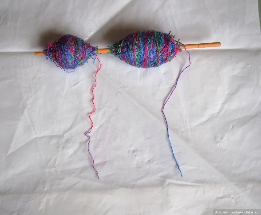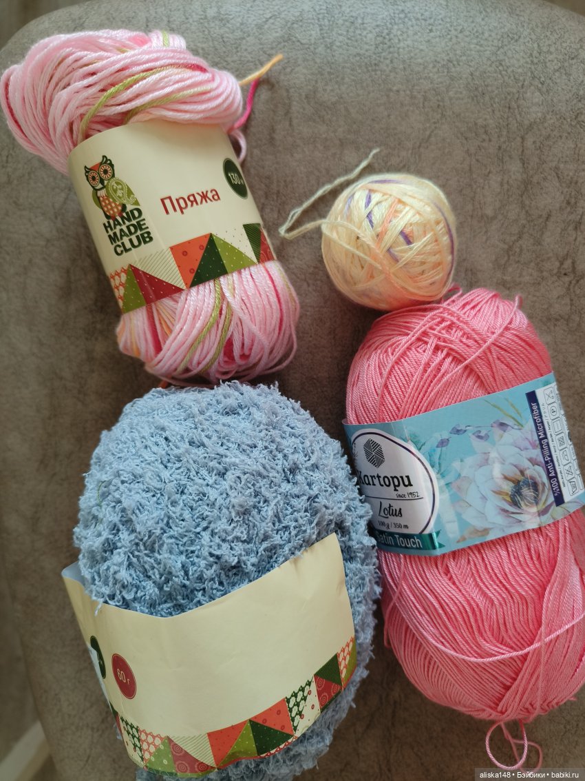 Розовая и жёлтая с пестринами — прошлогодняя. Жёлтую размотала на 2 мотка по 3 ниточки. Но в 3 ниточки на мелких кукол, типа баболи тоже толстовато, хочу один клубок перемотать в 2 и 1 нить. Но набираюсь мужества)))