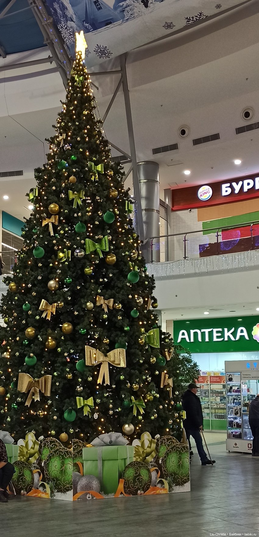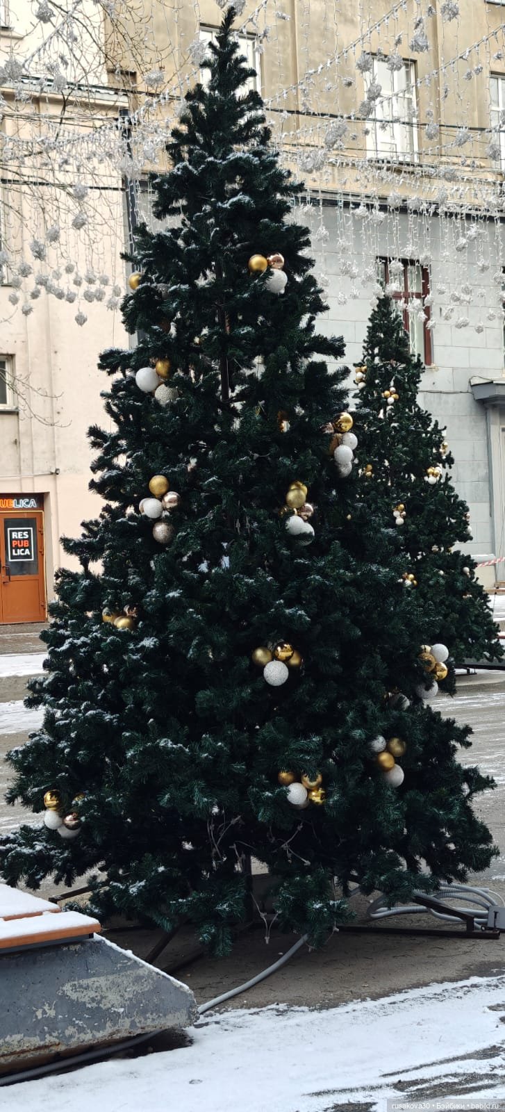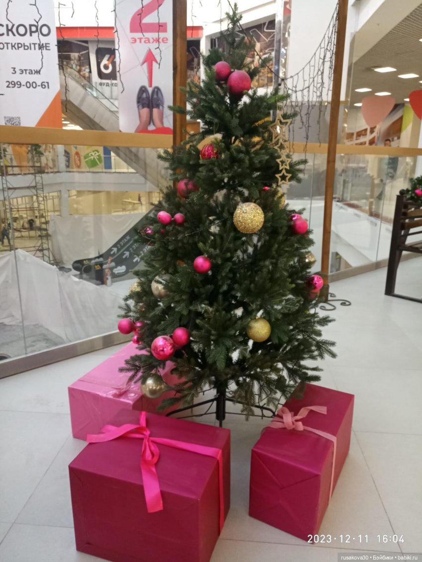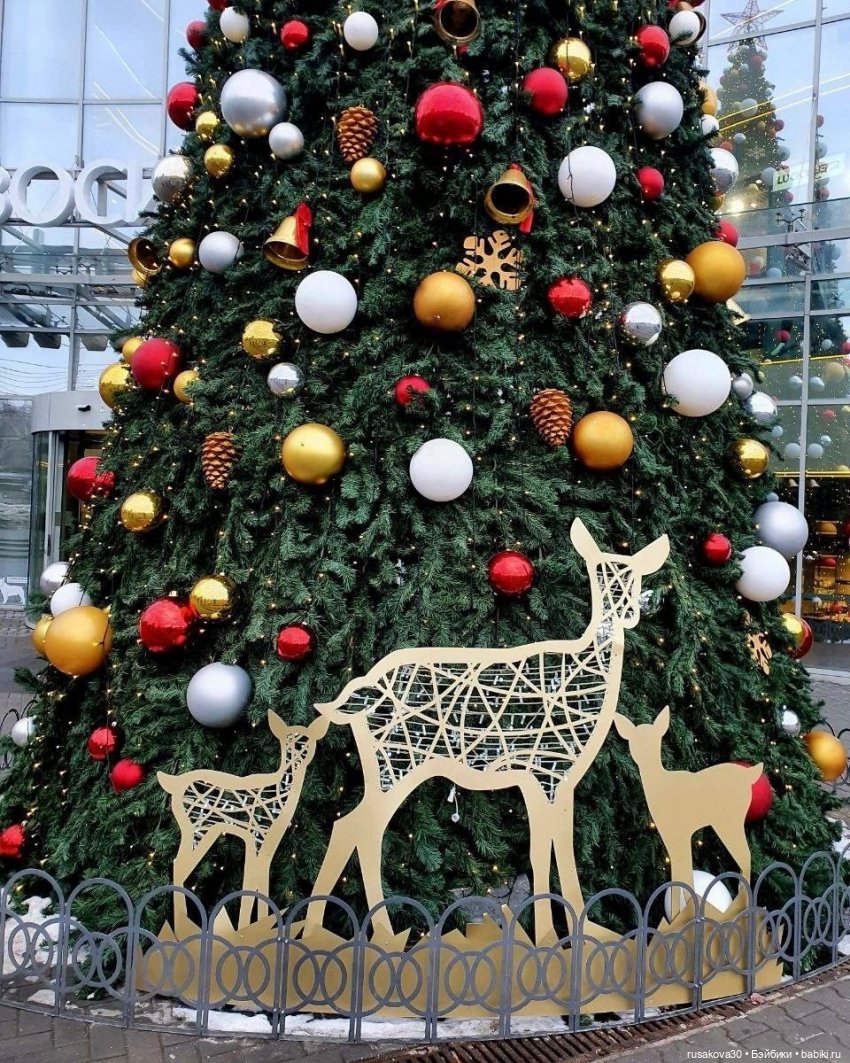 Не далеко от моего дома есть большой ТРЦ. Каждый год там наряжают красивую ёлку, причём каждый год по разному. В прошлом году на ёлке были большие синие шары, в этом году — зелёные и золотые.