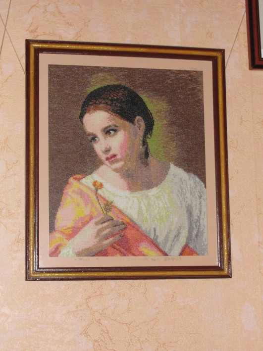 Самая первая крупная работа это Кипренский «Бедная Лиза» 1827г. комп. раскладка Харитонова М. Очень люблю эту вышивку, одна из самых, самых моих любимых