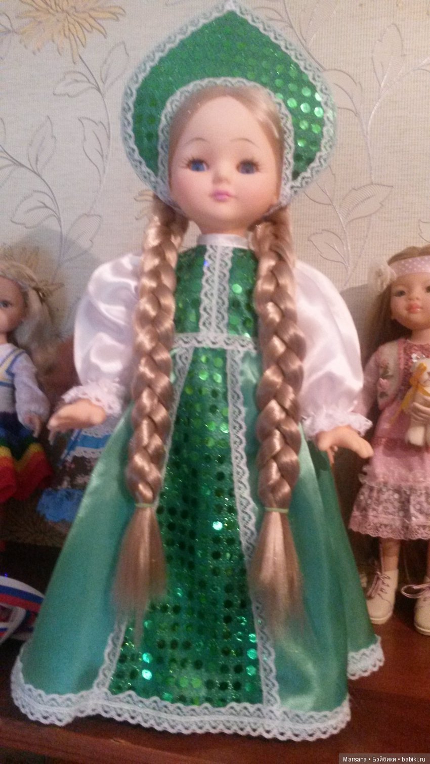 Василиса — не клюква, сарафан и головной убор — да. Из такой тканюшки, это ивановские ситцы, шьют полотенца и фартуки для хозяек. Иногда еще халаты, я видела. Кукла сама ничего, если не смотреть на одежду. Ну надо же… даже с пробором паричка умудрились промахнуться, смещен от середины.