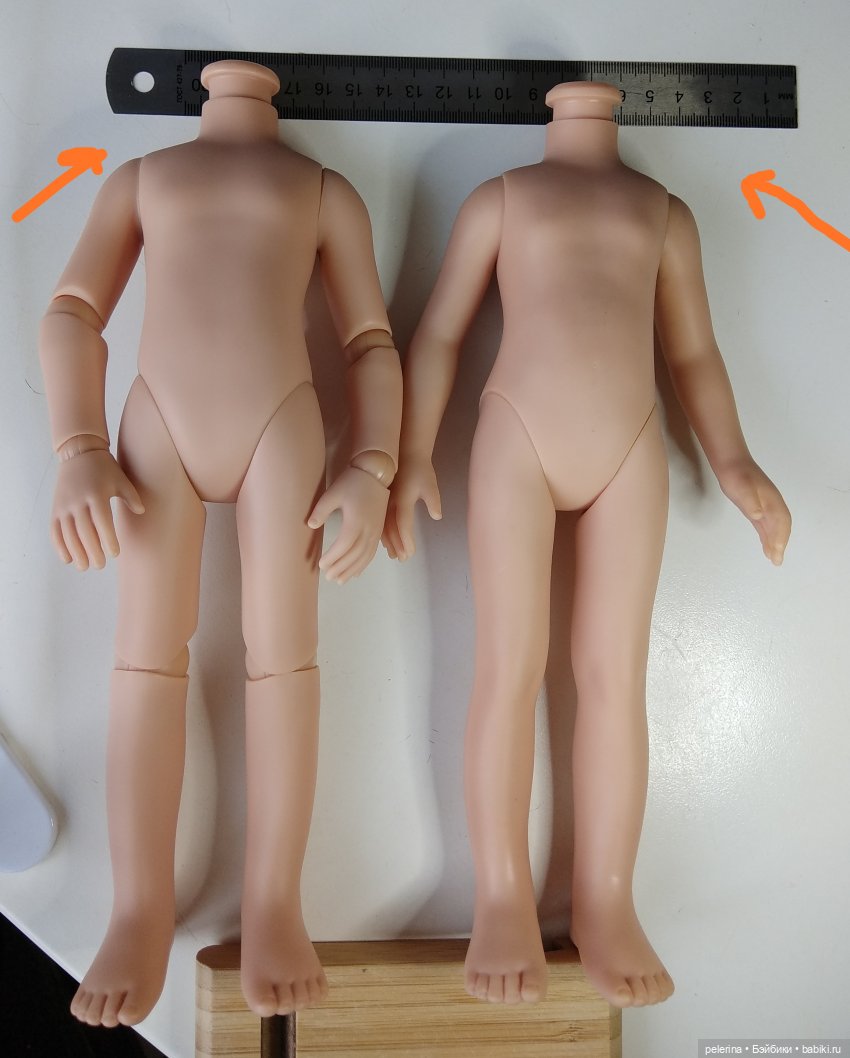 Вот лежат два тела рядом. Стопы на одном уровне и к выемке шеи шарнирного приставлена линейка под 90 градусов. Смотрите — расстояние от линейки до плеч у шарнирного и у простого тела разное — стрелками я показала. И сантиметром если померять — на 1 см шарнирное длиннее. Обхваты да, соврадают, за исключением ширины плеч (с учетом рук). Одежда, лиф которой плотно облегает тело 18 года, явно будет мала шарнирному в плечах.