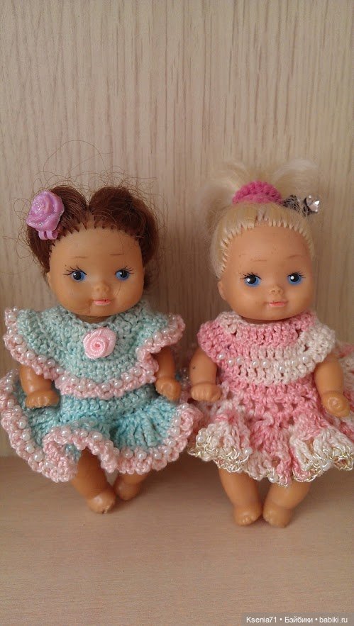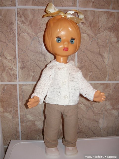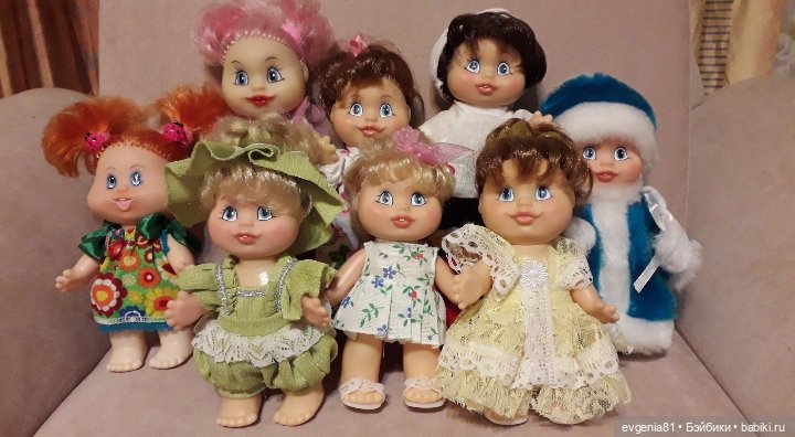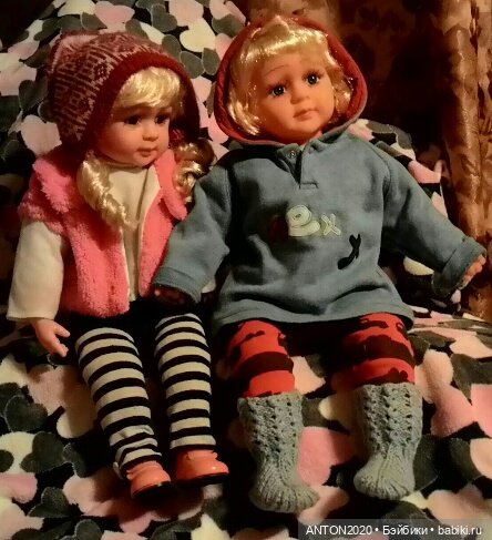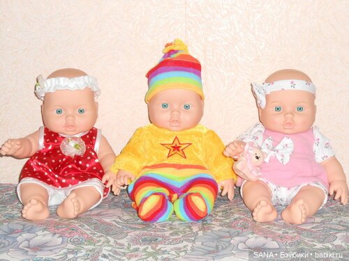 А пупсята на превьюшке и в топике — знакомые ребята! Тоже младшим дочерям купила пару, да ещё на подарки, да ещё на всякий случай… голубой и розовый комбез с колпачком, был и жёлтенький, как у вас. До сего момента из всех дожил один, второго искали и нашли как память из детства, даже успели поиграть — в точности как у вас, и искупать, и кашей накормить, и платье из носка сделать))