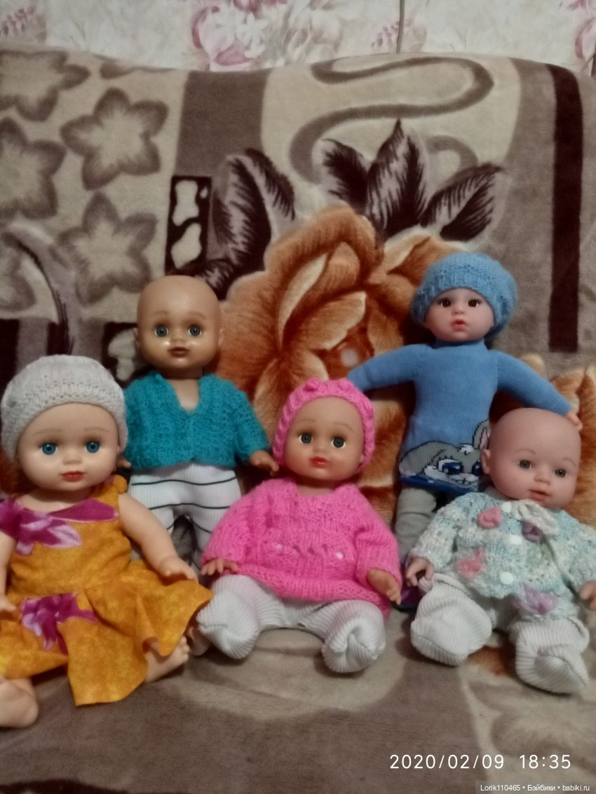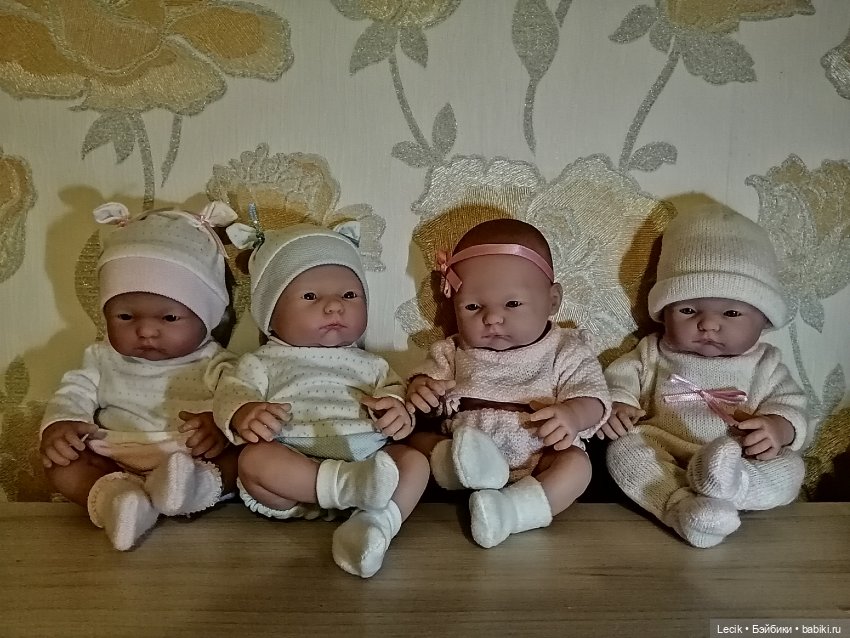 Это то же давнишняя фоточка, я своих малышей кукольных в один кадр собирала, снизу мои любимки тройняшки, справа, там они в родных комбезах, у них ещё колпачки были. А девочке я сарафанчик сшила, что б отличать её от мальчишек)