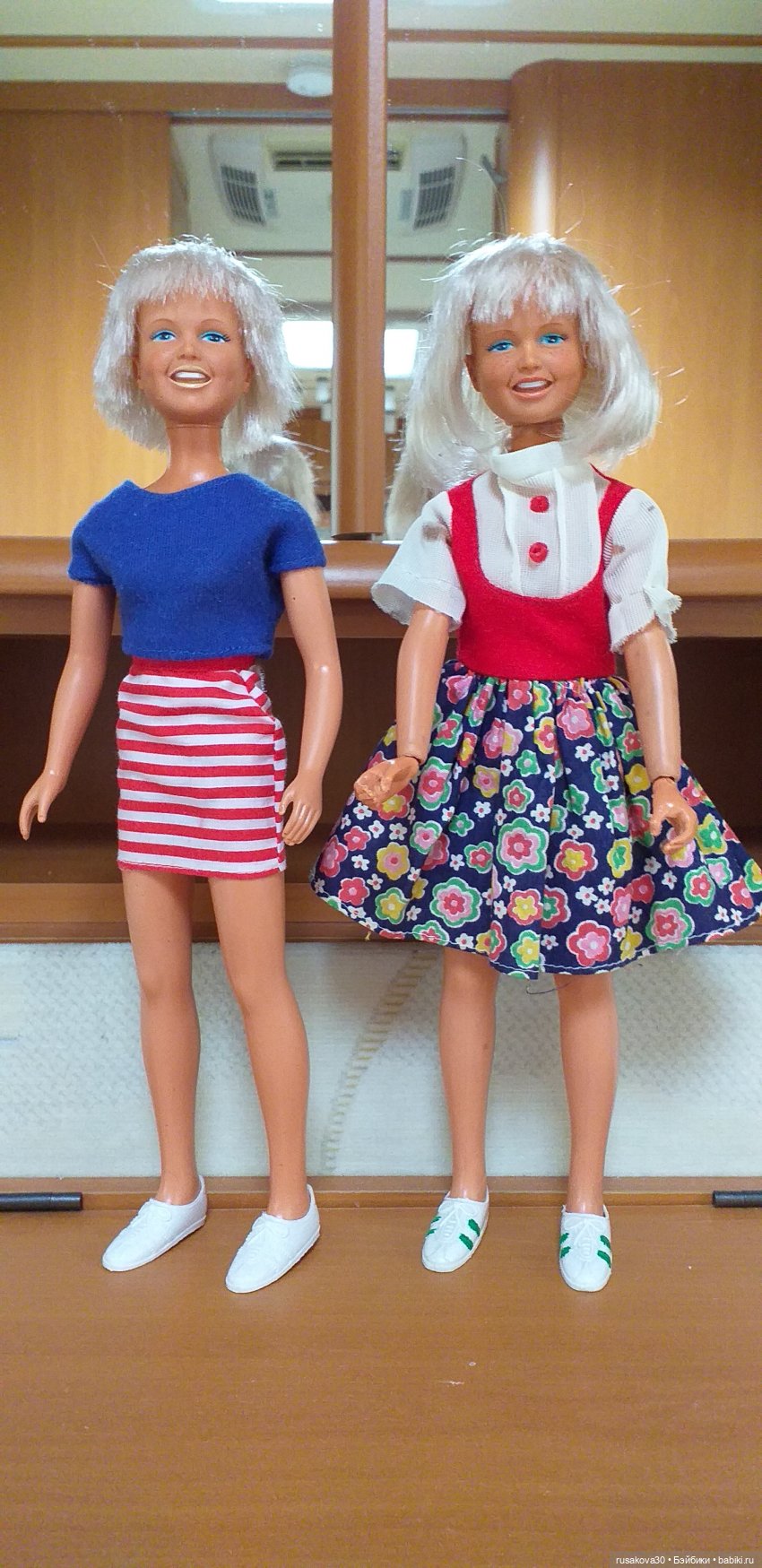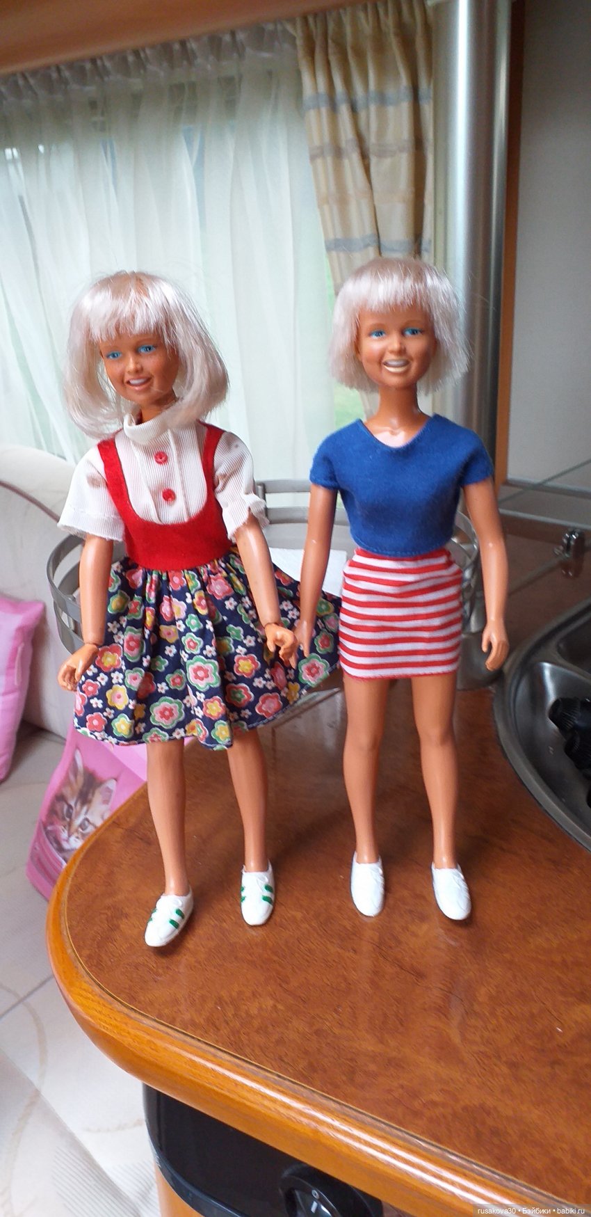 У нас, наконец-то, можно гулять! Мы с куколками воспользовались этой возможностью. Тем более, что моим Дасти достались новые комплекты! Мне очень нравится эта ткань с матрёшечками. Я шила из нее наряды для Барби. Теперь решила порадовать этих весёлых девчонок. Сшитые брюки и платье я дополнила вязаными кофтами. Надеюсь, что вам понравятся мои нарядницы и их рыжий друг!